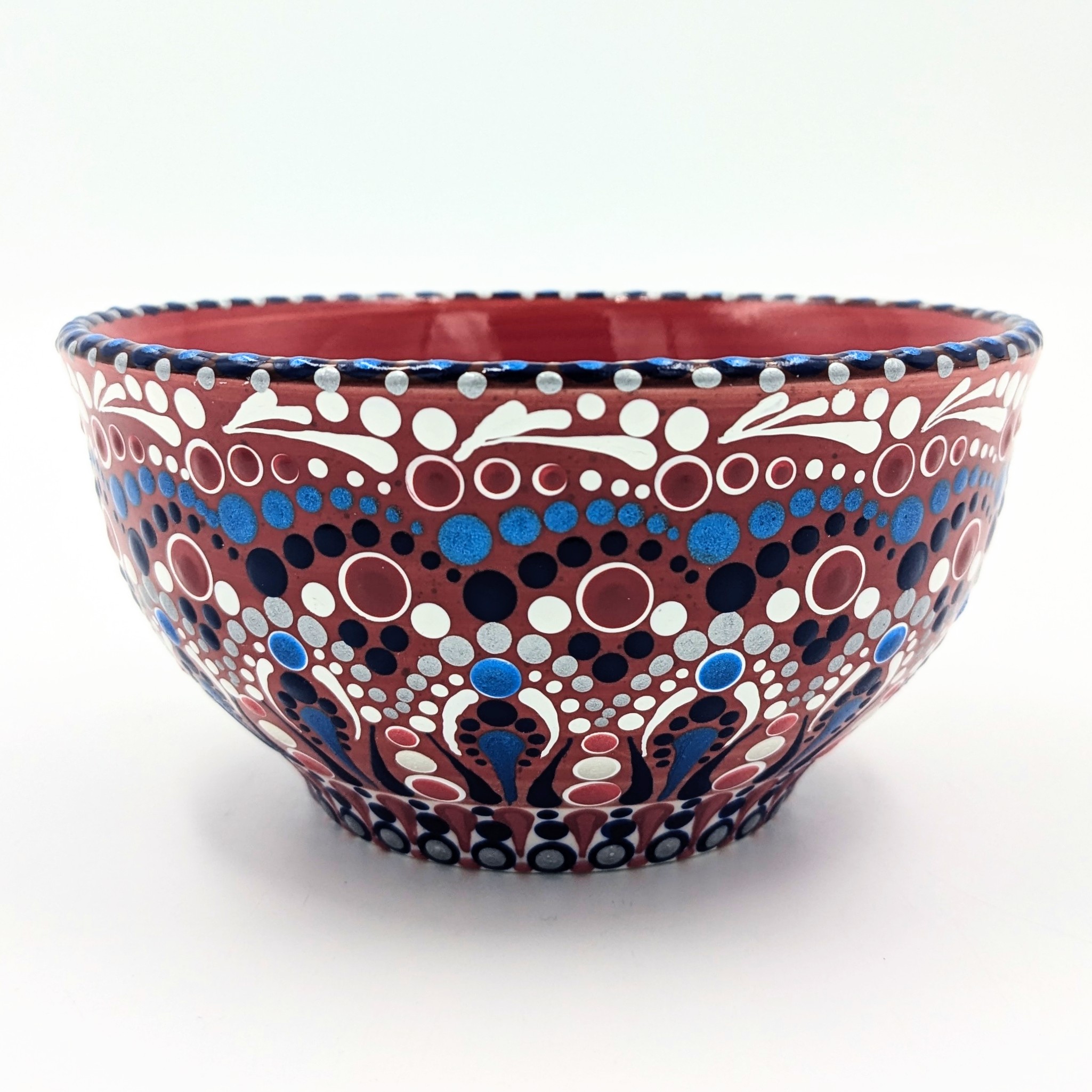 This hand-painted ceramic bowl features an intricate dot mandala design, celebrating the vibrant patriotic colors of red, white, and blue with functional elegance. Perfect as a unique gift for art lovers or a stylish addition to any room. Size: 4.75″W x 2.75″H