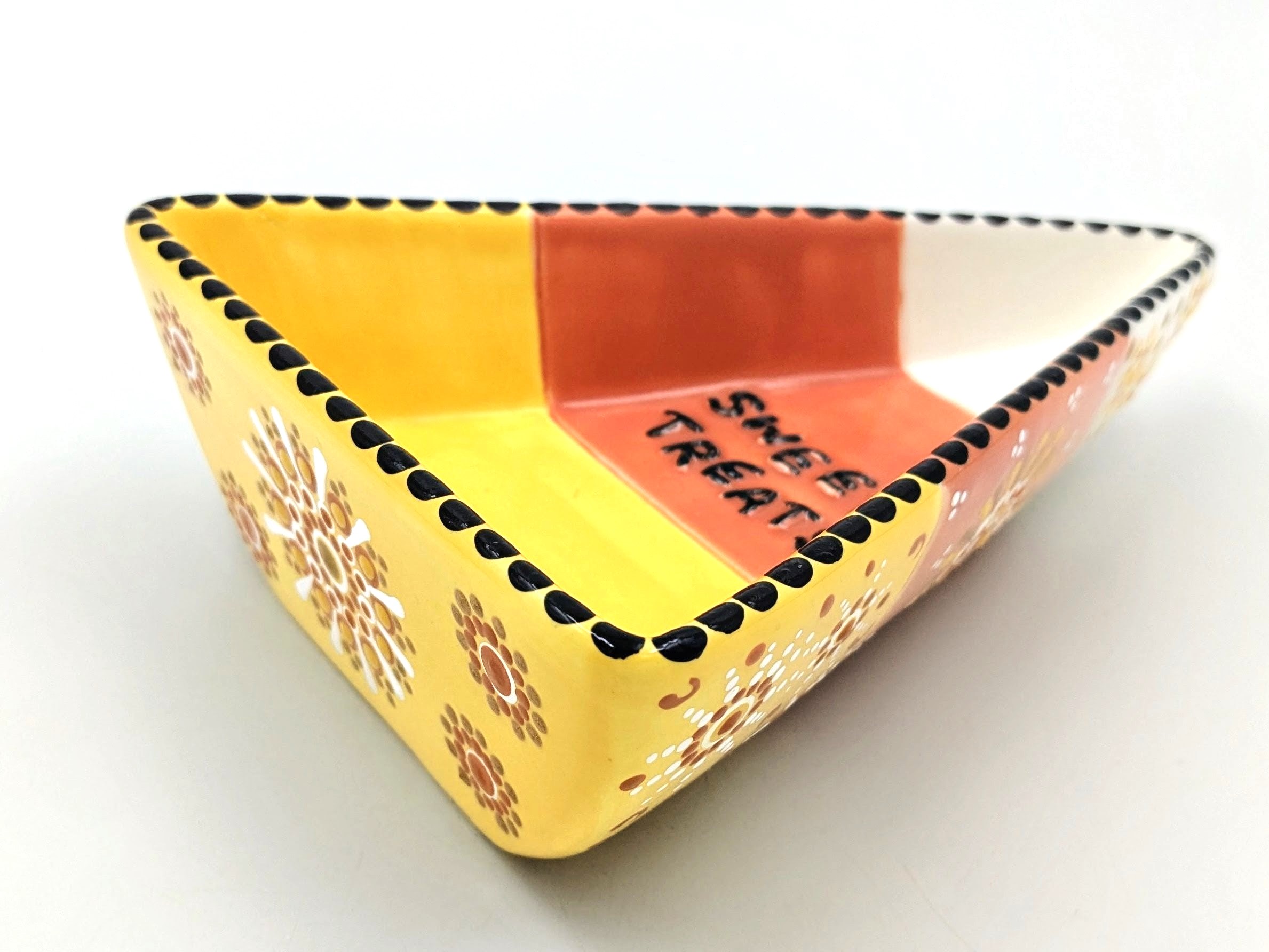 This fun hand-painted “Candy Corn” ceramic bowl features a complimentatry dot mandala design, blending vibrant colors with functional elegance. Perfect as a unique gift for art lovers or a stylish addition to any room. Size: 7″L x 5″W x 2.25″D