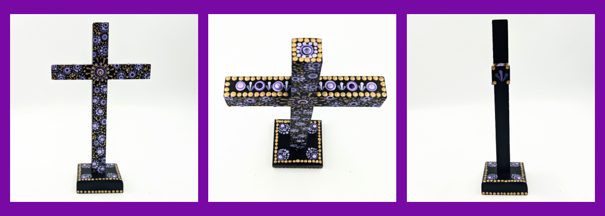 A hand-painted wooden cross with a sturdy base, featuring an intricate dot mandala design of royal purples and gold. A beautiful tabletop accent that brings color and artistry to any space. Size: 9″H x 5″W