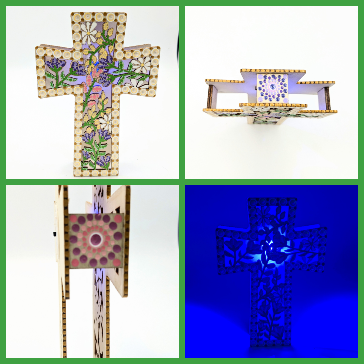 This freestanding wooden cross is hand-painted with a detailed dot mandala design, blending pastel colors with timeless craftsmanship. Designed for easy display, it is perfect for mantels, shelves, or entry tables – the LED lights adding warmth and handmade charm to your home decor. Each piece is carefully sealed for durability, making it a lasting accent that celebrates artistry and individuality.