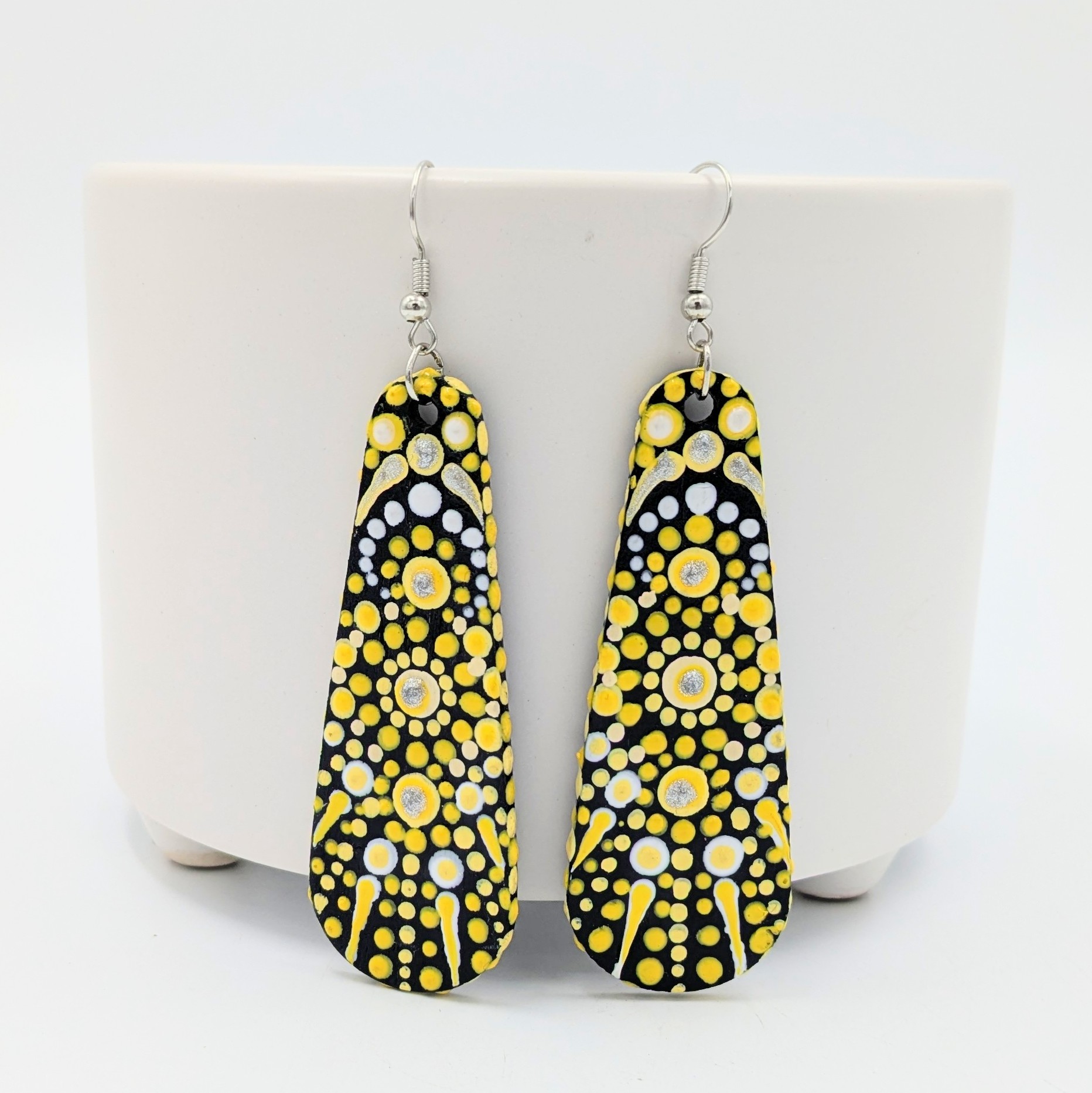 These lightweight dot mandala earrings are hand-painted on wood with a , and finished with nickel-free findings for comfortable, all-day wear. Size: 2.75″L x 1″W