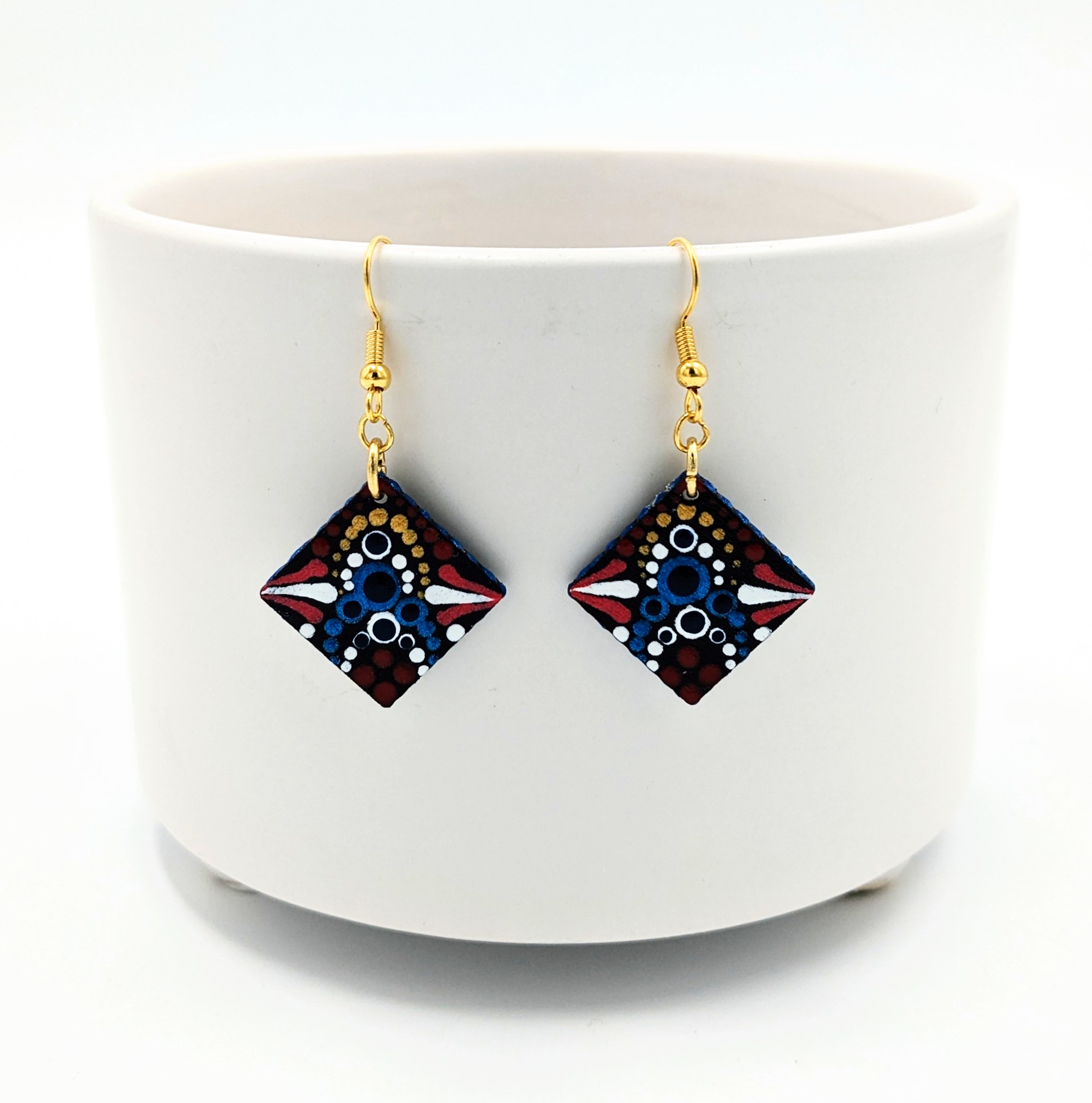 These lightweight dot mandala earrings are hand-painted on wood with a patriotic design of red, white, and blue, and finished with nickel-free findings for comfortable, all-day wear. Size: 1″
