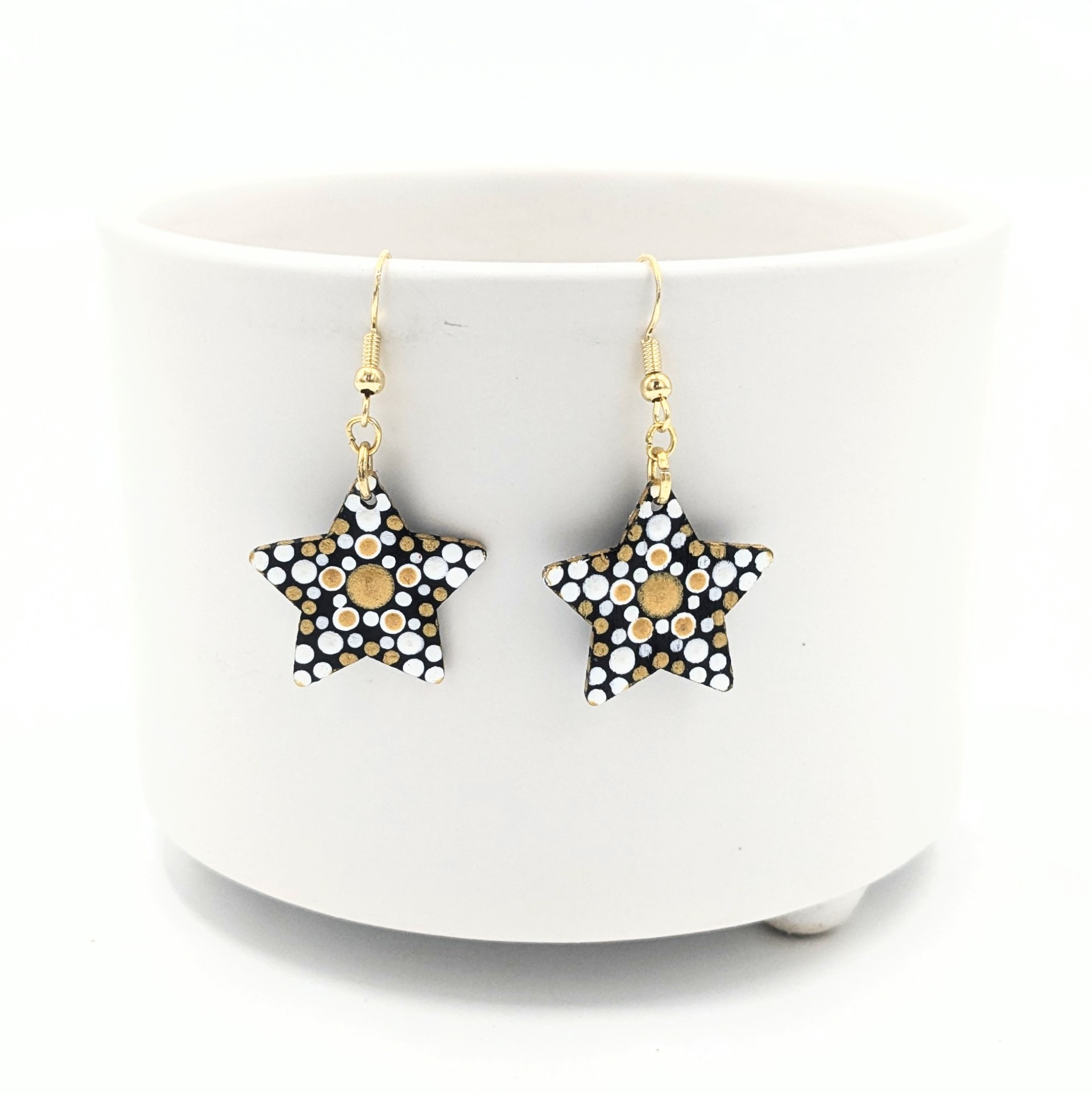 These lightweight dot mandala earrings are hand-painted on wood with a festive color scheme of gold and white, and finished with nickel-free findings for comfortable, all-day wear. Size: 1″