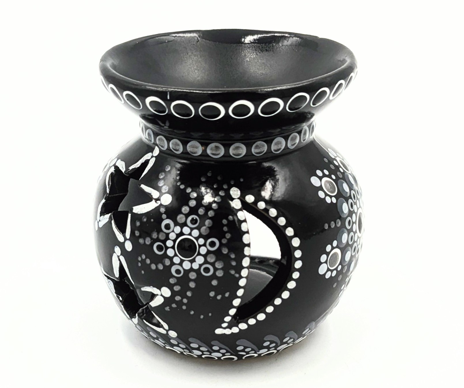 A hand-painted dot mandala essential oil/wax melt holder with a celestial theme – designed for gentle fragrance and artful ambiance. Size: 3″H x 2.5″W