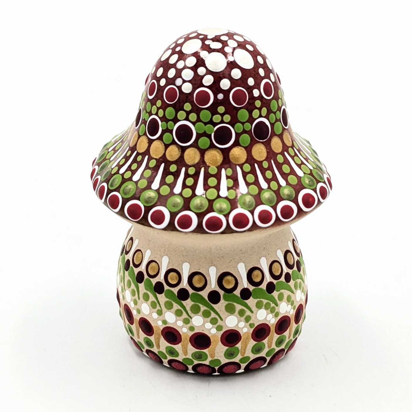 This decorative ceramic mushroom features a detailed hand-dotted Christmas-themed mandala design for a playful, handcrafted feel. A charming accent for shelves or desks. Size: 3″H x 2″W