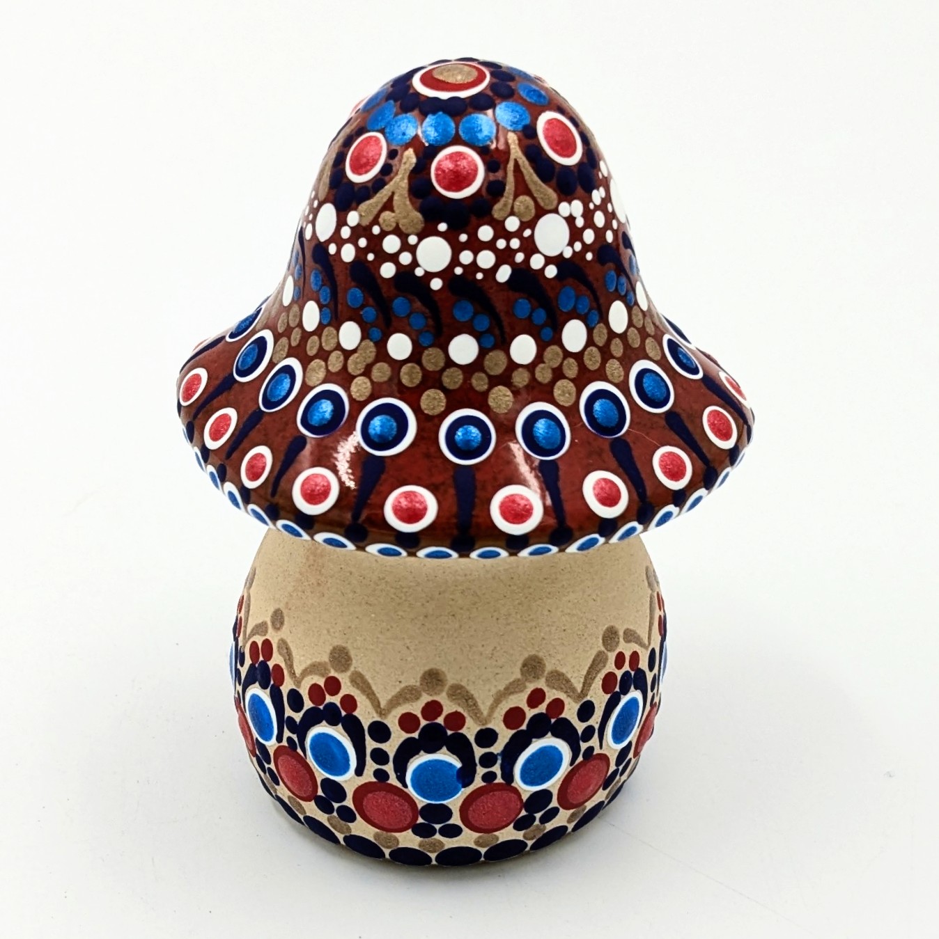 This decorative ceramic mushroom features a detailed hand-dotted red, white, and blue mandala design for a patriotic, handcrafted feel. A charming accent for shelves or desks. Size: 3″H x 2″W