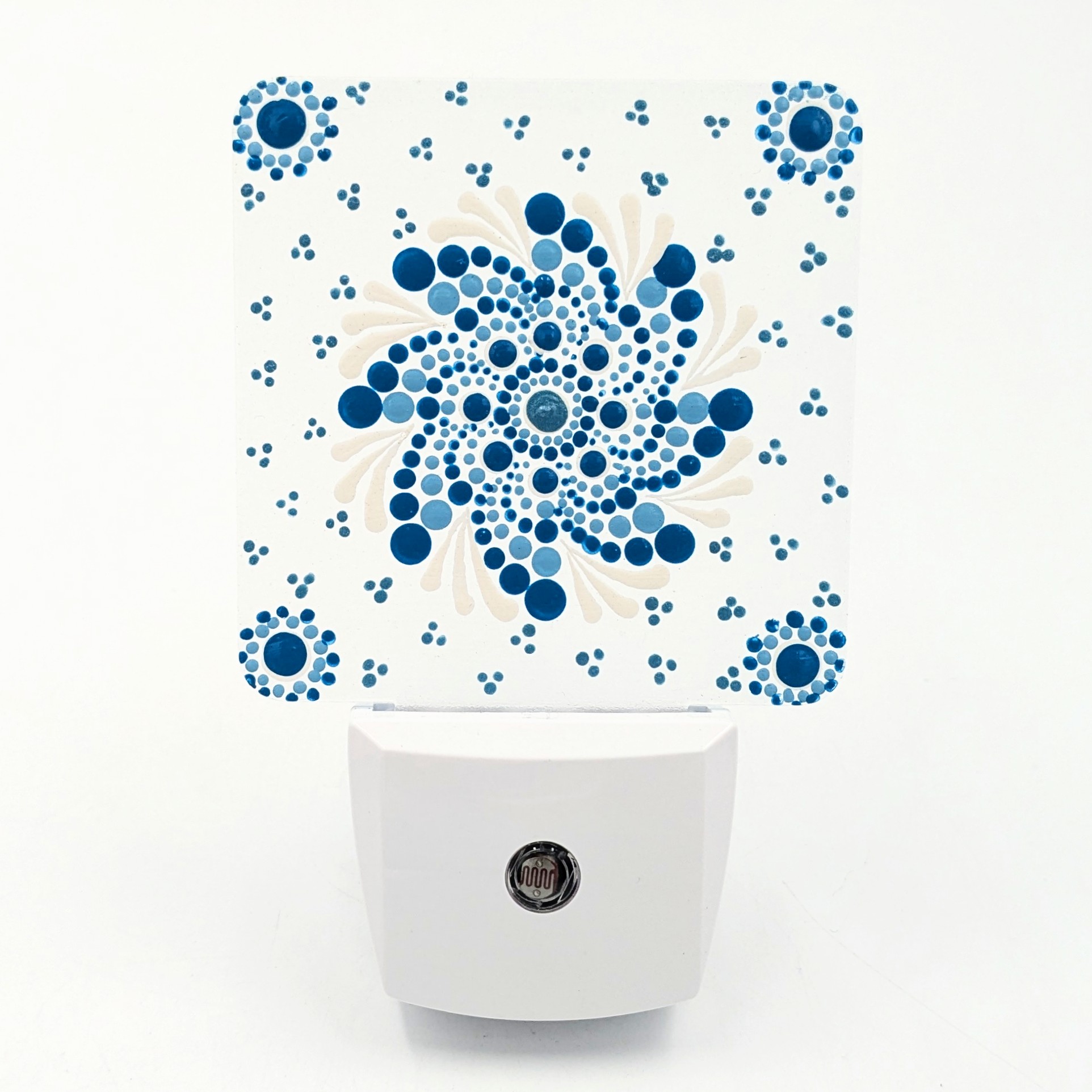 This plug?in night light features a unique dot mandala design that illuminates gently after dark. Compact and easy to position, it adds warmth and visibility without harsh brightness. Pair with an energy?efficient LED bulb to preserve the artwork and enjoy long?lasting, low?heat illumination.