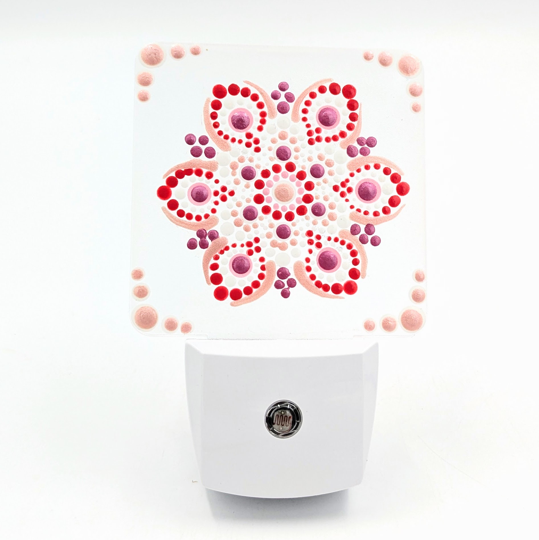 This plug?in night light features a unique dot mandala design that illuminates gently after dark. Compact and easy to position, it adds warmth and visibility without harsh brightness. Pair with an energy?efficient LED bulb to preserve the artwork and enjoy long?lasting, low?heat illumination.