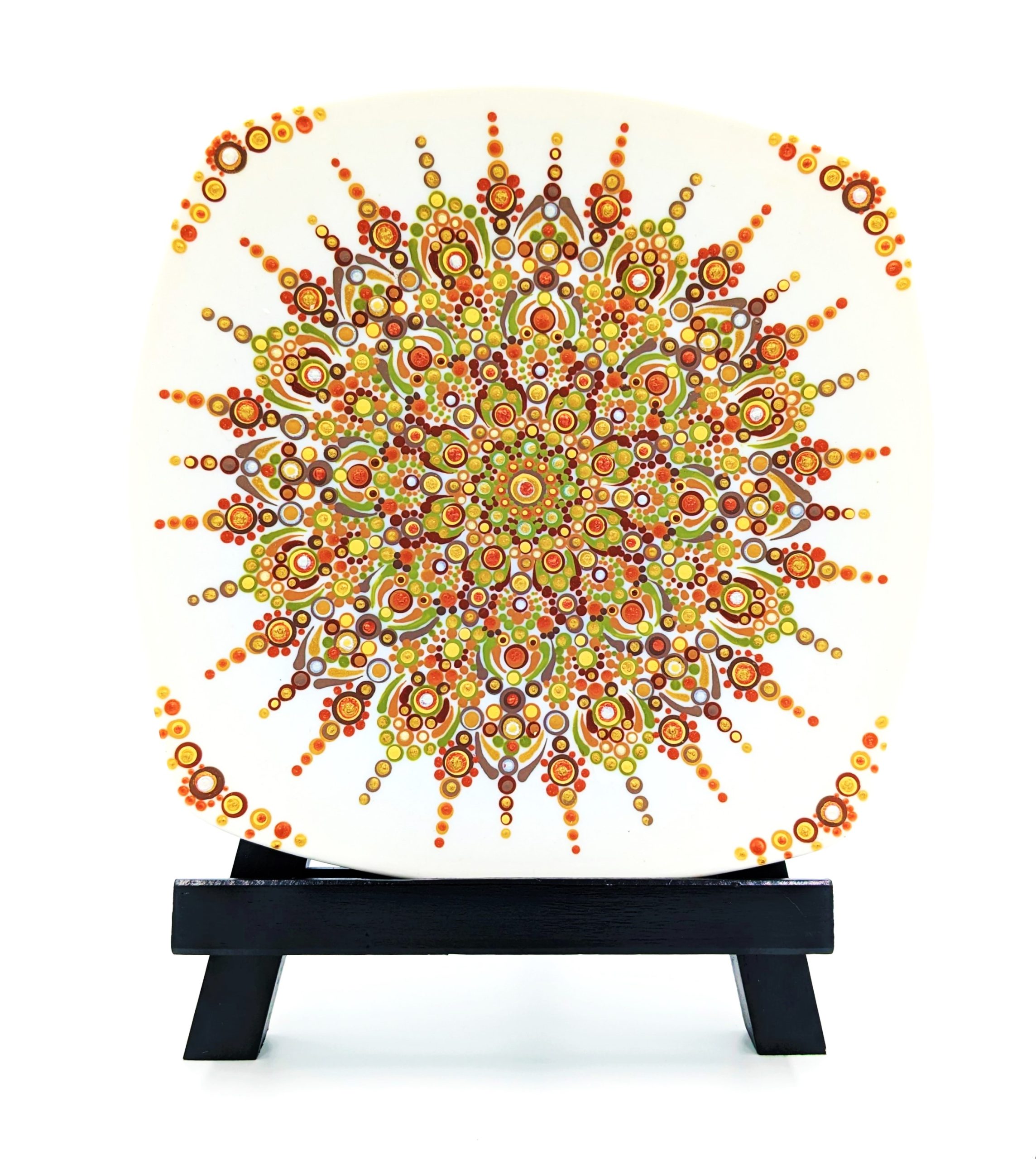 Detailed hand-dotted mandala patterns, perfect for Fall decor, turn this ceramic plate into a functional piece that feels like a small work of art. Size: 9.5″