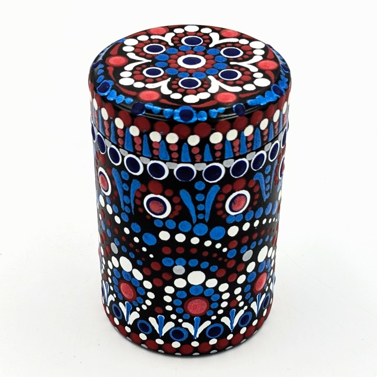 Sturdy metal is softened by a hand?painted dot mandala designs of red, white, and blue, creating a small storage piece with expressive charm. Size: 2.75″H x 1.75″W