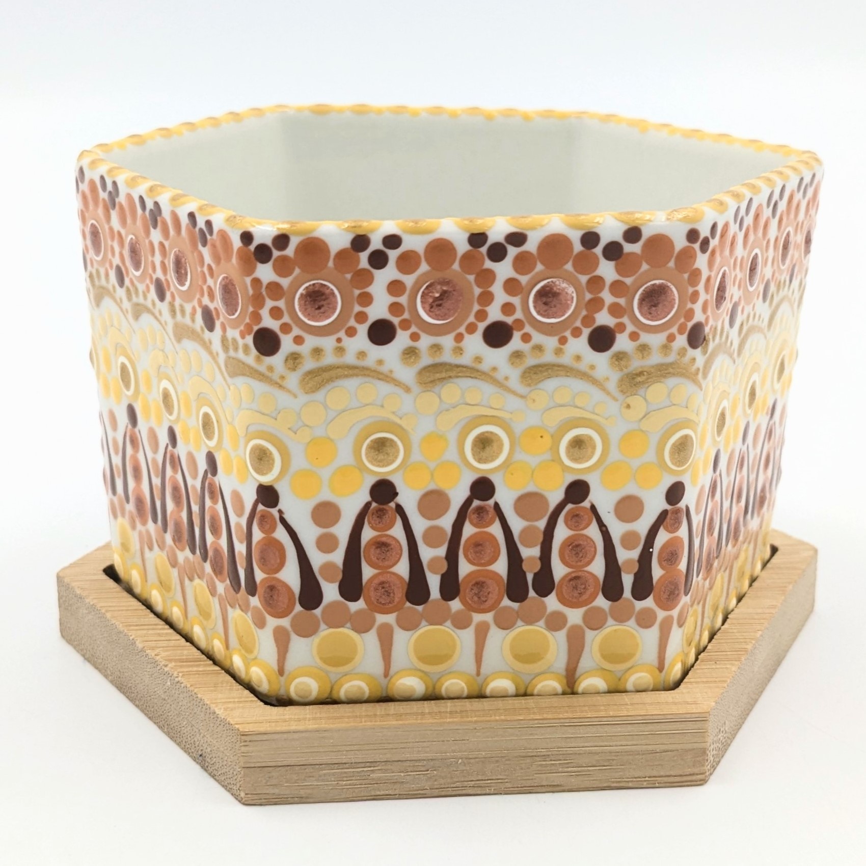 A cozy ceramic pot with a bamboo base, adorned with sunny hand-painted dot mandala patterns in delicious warm tones, perfect for showcasing small plants with style. Size: 3.75″W x 2.5″H