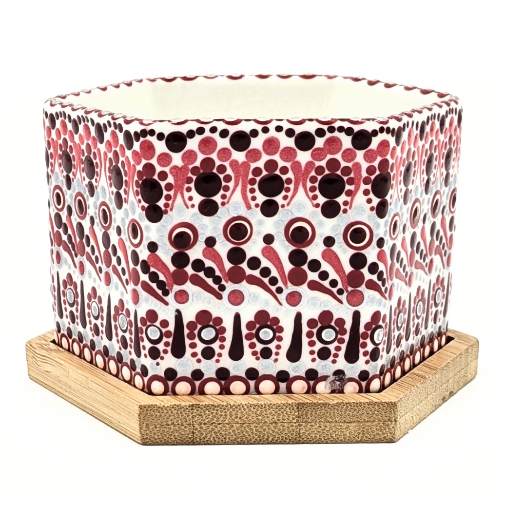 A cozy ceramic pot with a bamboo base, adorned with festive hand-painted dot mandala patterns, perfect for showcasing small plants with style. Size: 3.75″W x 2.5″H