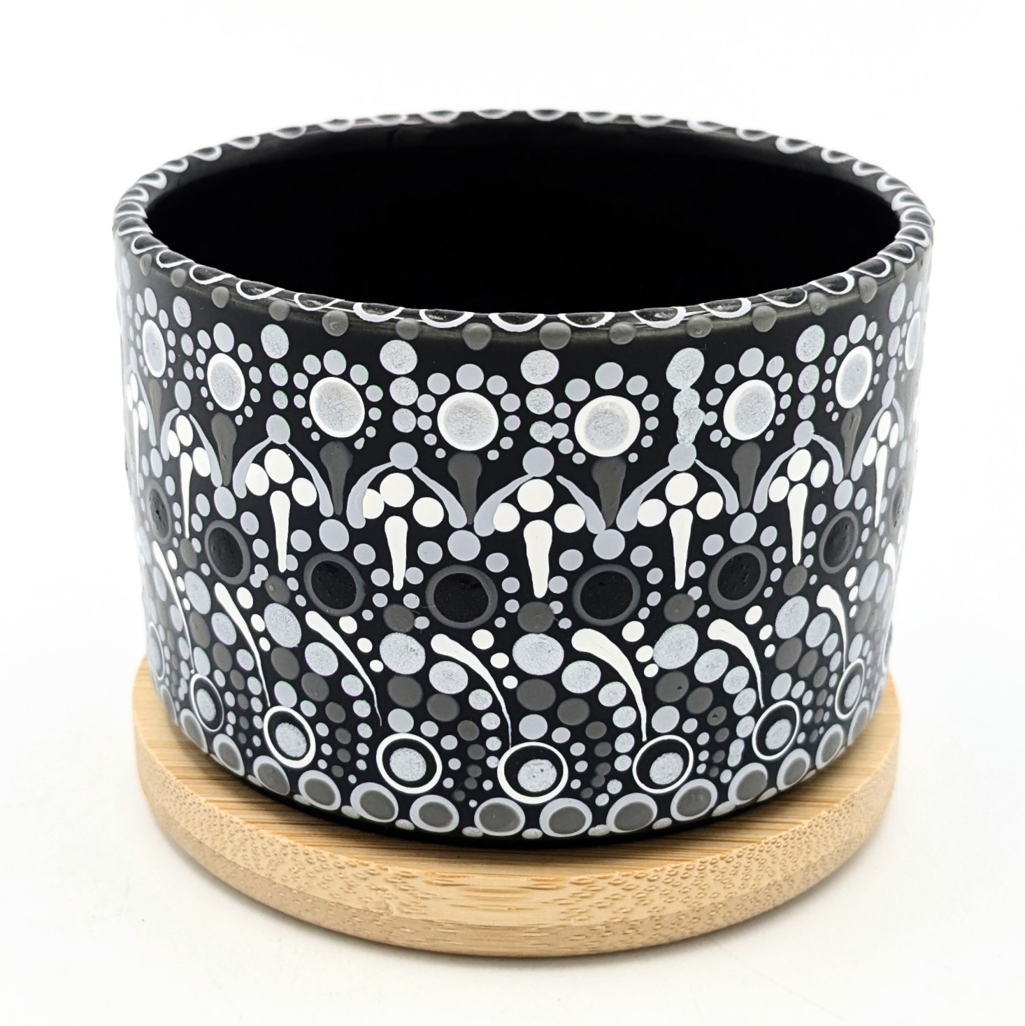 A cozy ceramic pot with a bamboo base, adorned with classy hand-painted dot mandala patterns, perfect for showcasing small plants with style. Size: 3.5″H x 3.5″W