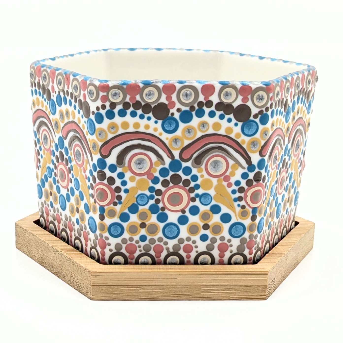 A cozy ceramic pot with a bamboo base, adorned with a delightful combination of warm and cool toned hand-painted dot mandala patterns, perfect for showcasing small plants with style. Size: 3.75″W x 2.5″H