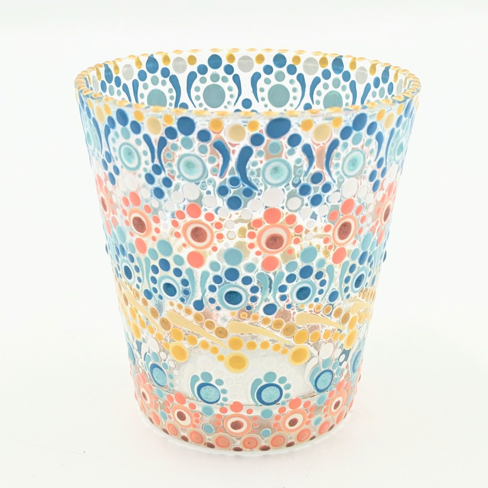 A hand-painted dot mandala tea light holder, in fresh Spring colors, that adds a soft, cozy glow and a pop of color to any space – perfect for shelves, tables, or bedside ambiance. Size: 3.25″H x 3″W