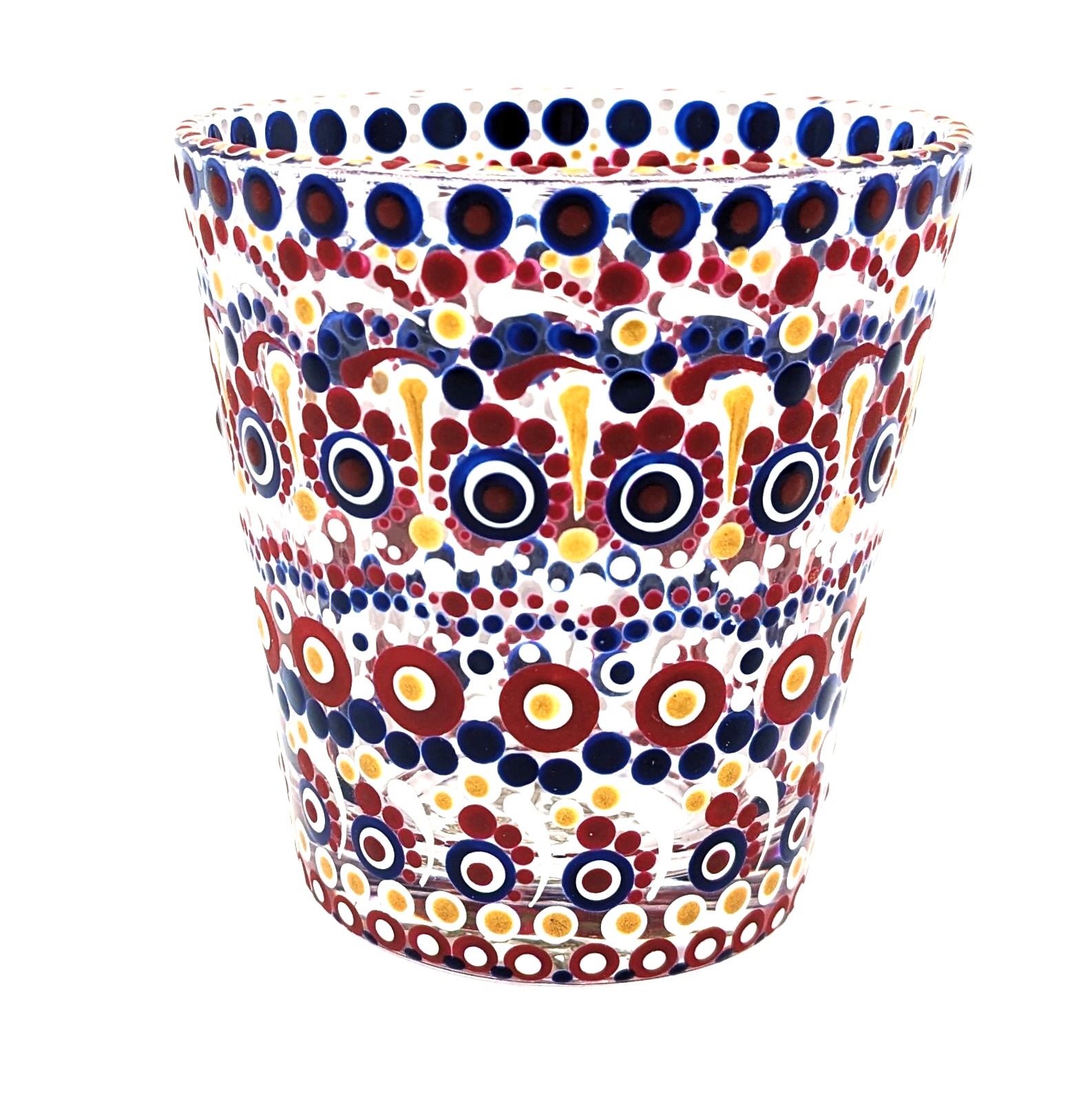 A hand-painted dot mandala tea light holder, featuring a patriotic red, white, and blue, that adds a soft, cozy glow and a pop of color to any space – perfect for shelves, tables, or bedside ambiance.