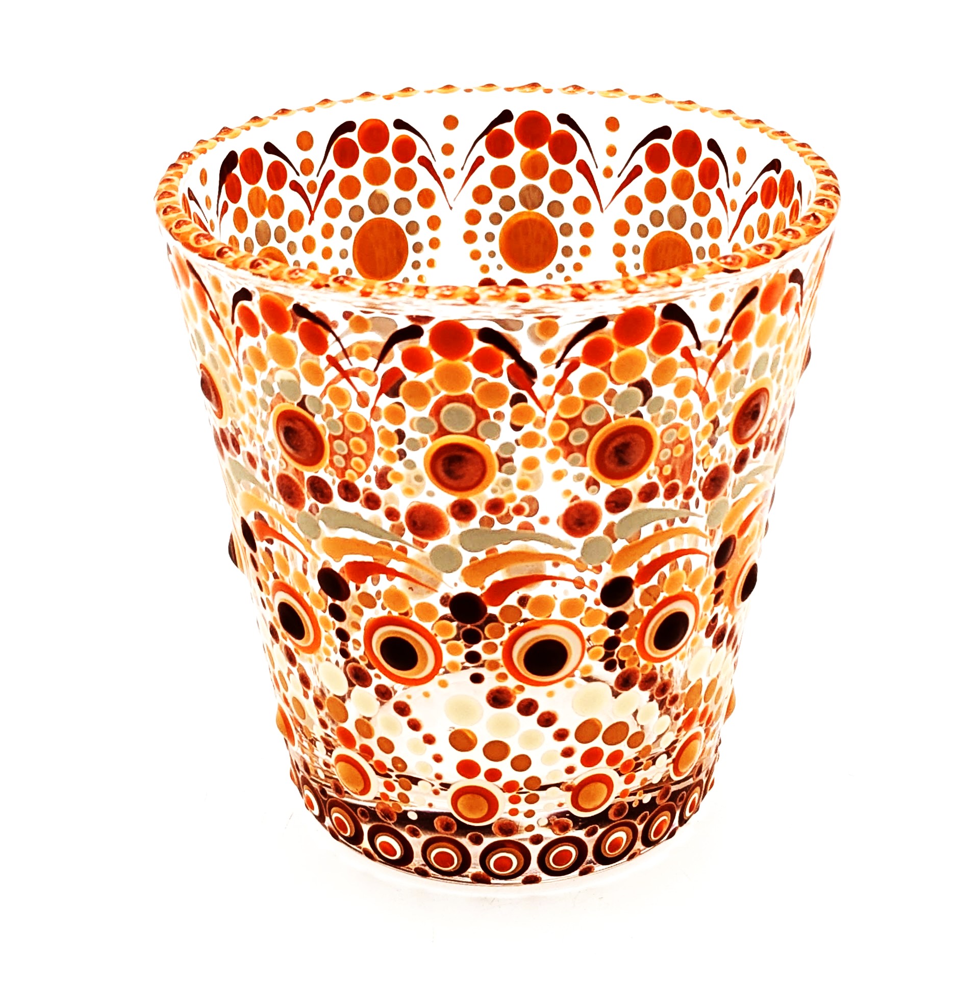 A hand-painted dot mandala tea light holder, in orange, peach, and tan, that adds a soft, cozy glow and a pop of color to any space – perfect for shelves, tables, or bedside ambiance. Size: 3.25″H x 3″W