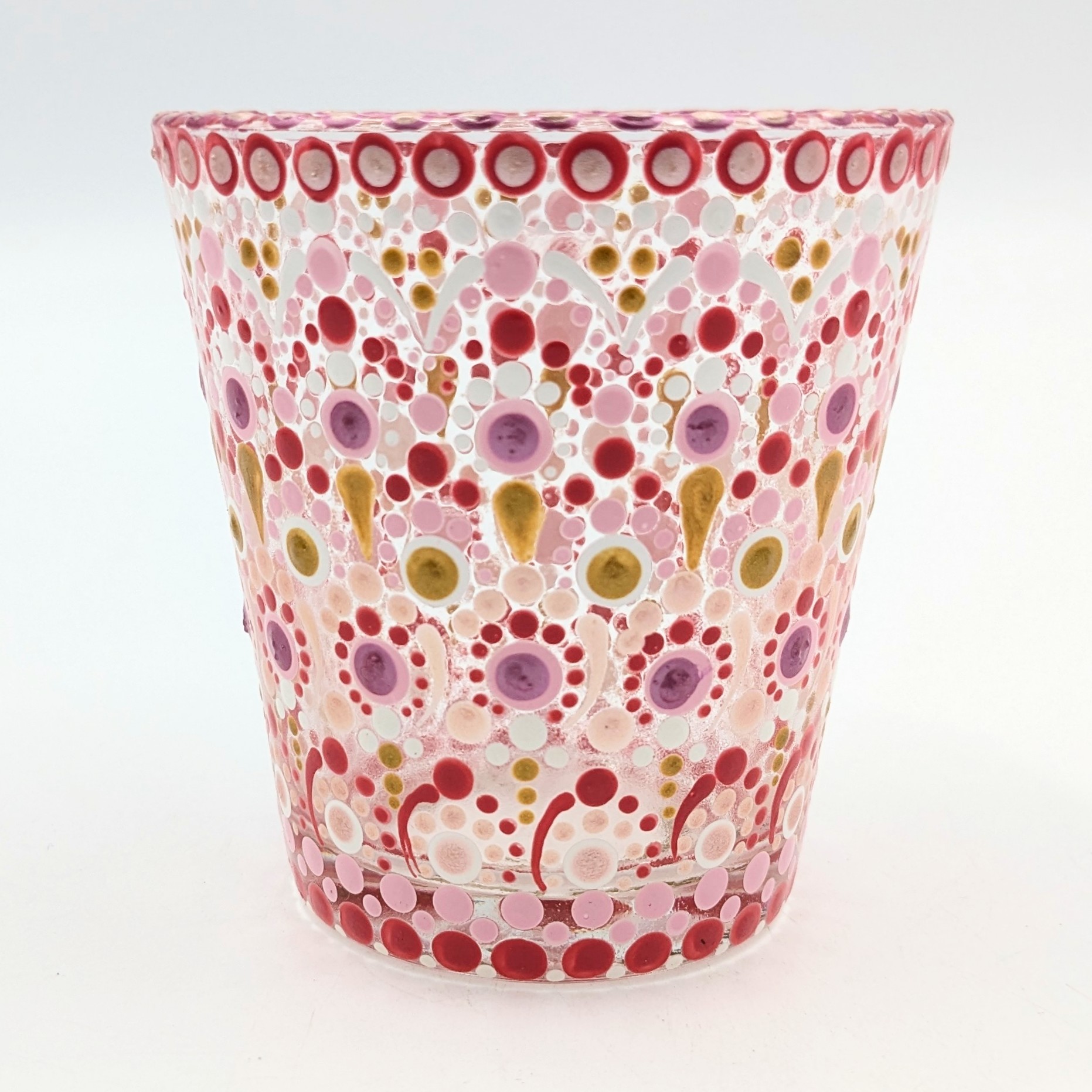 A hand-painted dot mandala tea light holder, pinks, white, and gold, that adds a soft, cozy glow and a pop of color to any space – perfect for shelves, tables, or bedside ambiance. Size: 3.25″H x 3″W