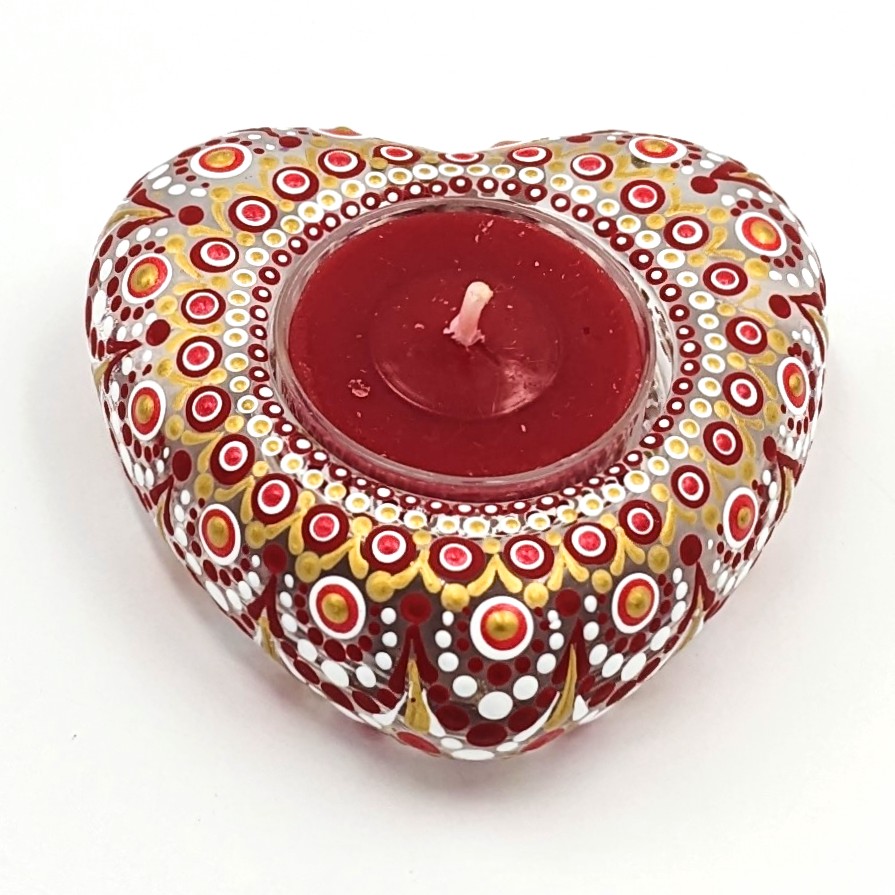 A heart-shaped glass tea light holder, hand-painted in dot mandala art, featuring the regal tones of red, burgundy, and gold. It will add a soft, cozy glow and a pop of color to any space – perfect for shelves, tables, or bedside ambiance. Size: 3.25″W x 1″H