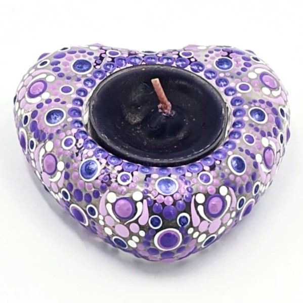 A heart-shaped glass tea light holder, hand-painted in dot mandala art, featuring purple, mauve, and white. It will add a soft, cozy glow and a pop of color to any space – perfect for shelves, tables, or bedside ambiance. Size: 3.25″W x 1″H