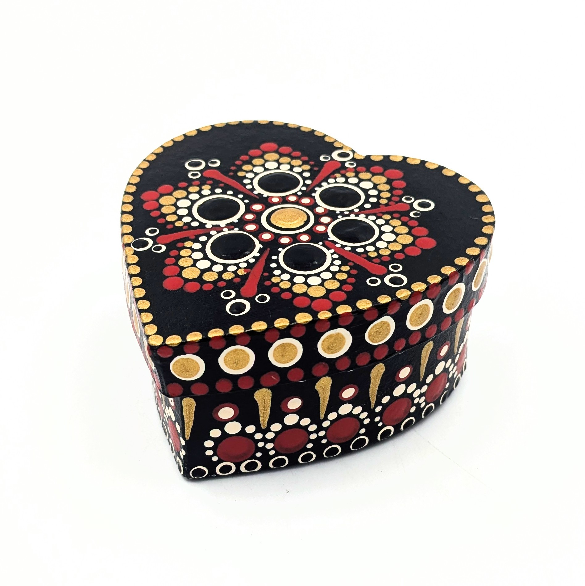 A hand-painted paper mรขchรฉ treasure box featuring an intricate red, black, and bronze dot mandala design. Lightweight yet durable, this unique piece is perfect for storing jewelry, keepsakes, or small treasures while adding a touch of artistic charm to any space. Size: 3″W x 1.5″H