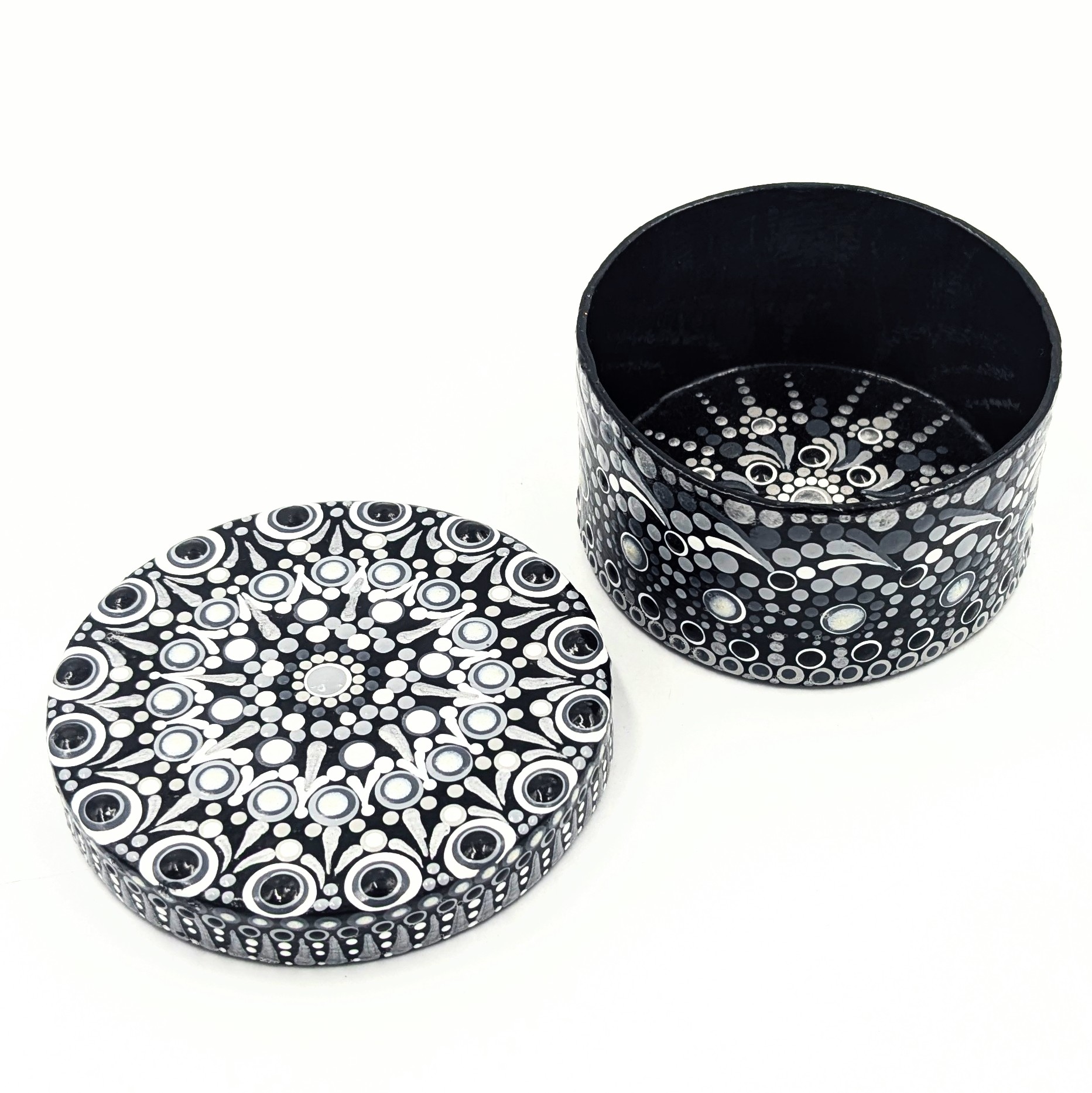 A hand-painted paper mรขchรฉ treasure box featuring a detailed dot mandala design of classic black, white and silver. Lightweight yet durable, this unique piece is perfect for storing jewelry, keepsakes, or small treasures while adding a touch of artistic charm to any space. Size: 3″W x 1.5″H