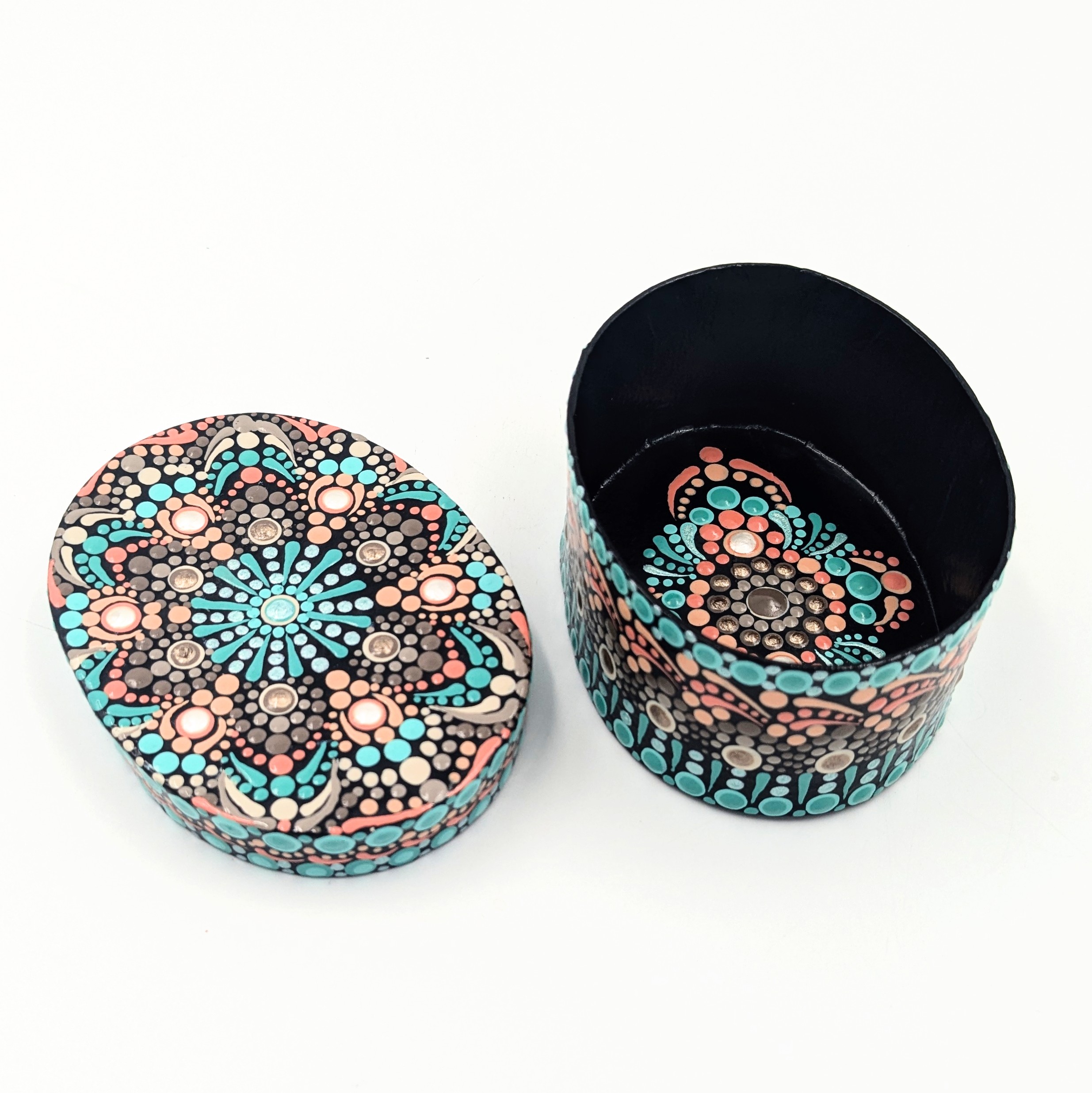 This hand-painted paper mรขchรฉ treasure box features a vibrant dot mandala design that adds a touch of artistry to any space. Lightweight yet durable, it is perfect for storing jewelry, keepsakes, or other small treasures while serving as a unique decorative accent. Each box is carefully crafted and painted by hand, making it a one-of-a-kind piece that combines functionality with artistic charm. Ideal for adding color and personality to your home or as a thoughtful gift for someone who appreciates handmade art.