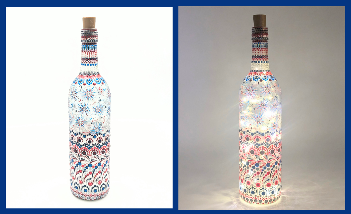 A glass wine bottle adorned with intricate dot mandala art celebrating America with the red, white, and blue. Perfect as a decorative accent or functional piece for holding flowers, twinkle lights, or simply adding a touch of artistry to any space. Size: 12″T x 3″W