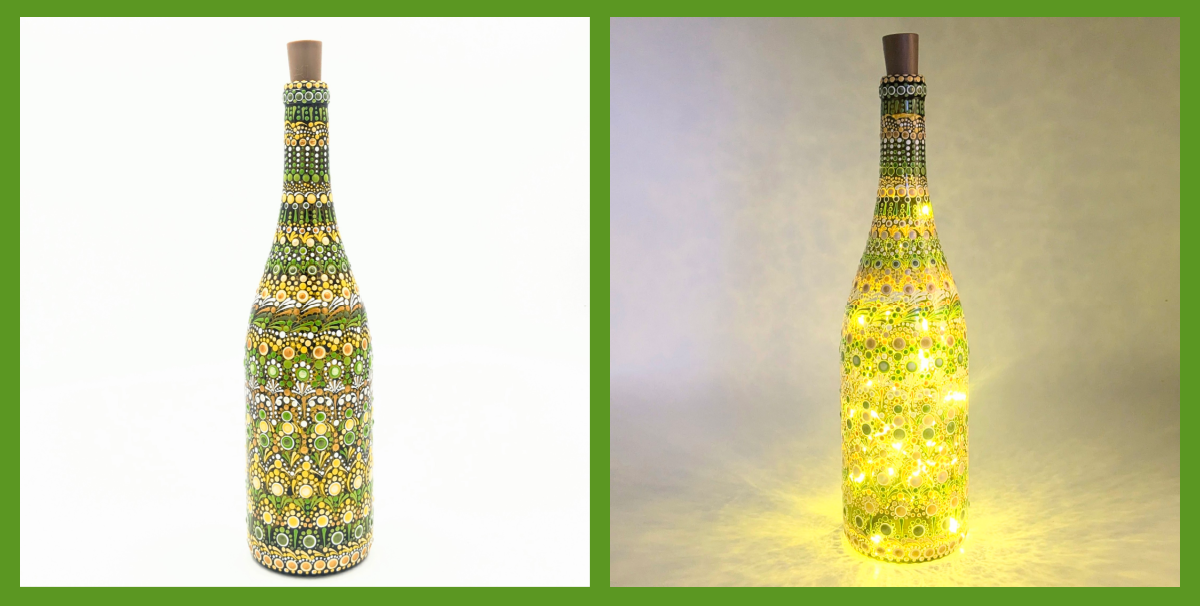 A glass wine bottle adorned with intricate dot mandala art in greens and yellows. Perfect as a decorative accent or functional piece for holding flowers, twinkle lights, or simply adding a touch of artistry to any space. Size: 12″T x 3″W