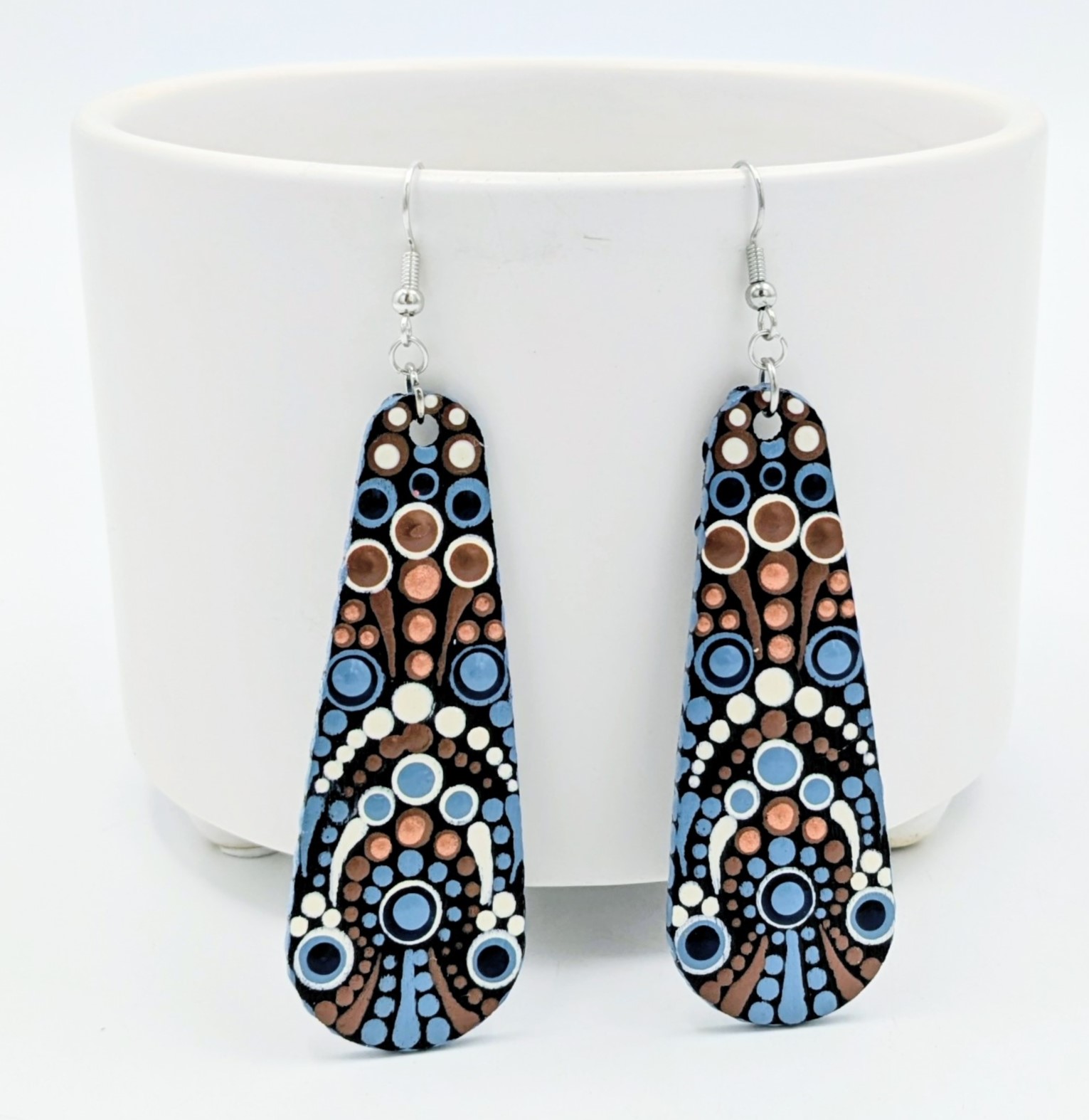 These lightweight dot mandala earrings are hand-painted on wood with a rustic blue, cream, rust, and copper design, and finished with nickel-free findings for comfortable, all-day wear.