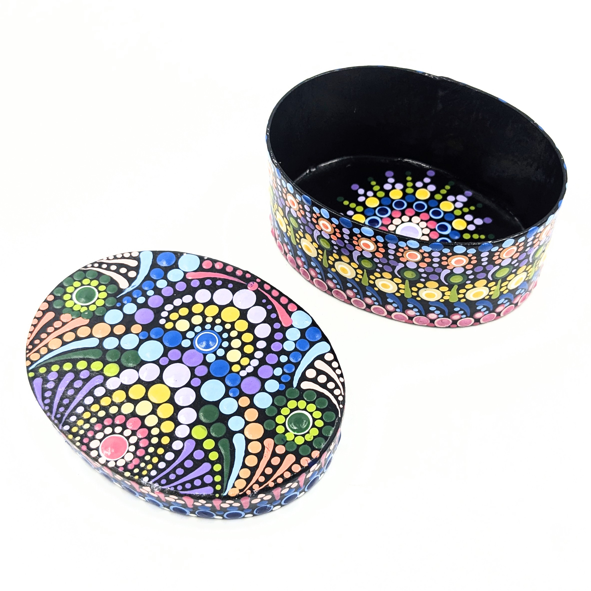 This small oval paper mache box and lid is hand-painted inside and out with a detailed dot mandala design, creating a striking blend of artistry and functionality. Perfect for storing jewelry, keepsakes, or other small treasures, its vibrant colors and intricate patterns make it a beautiful accent for any space. Crafted with care, this one-of-a-kind piece adds a touch of handmade charm to your home and makes a thoughtful gift for someone special.