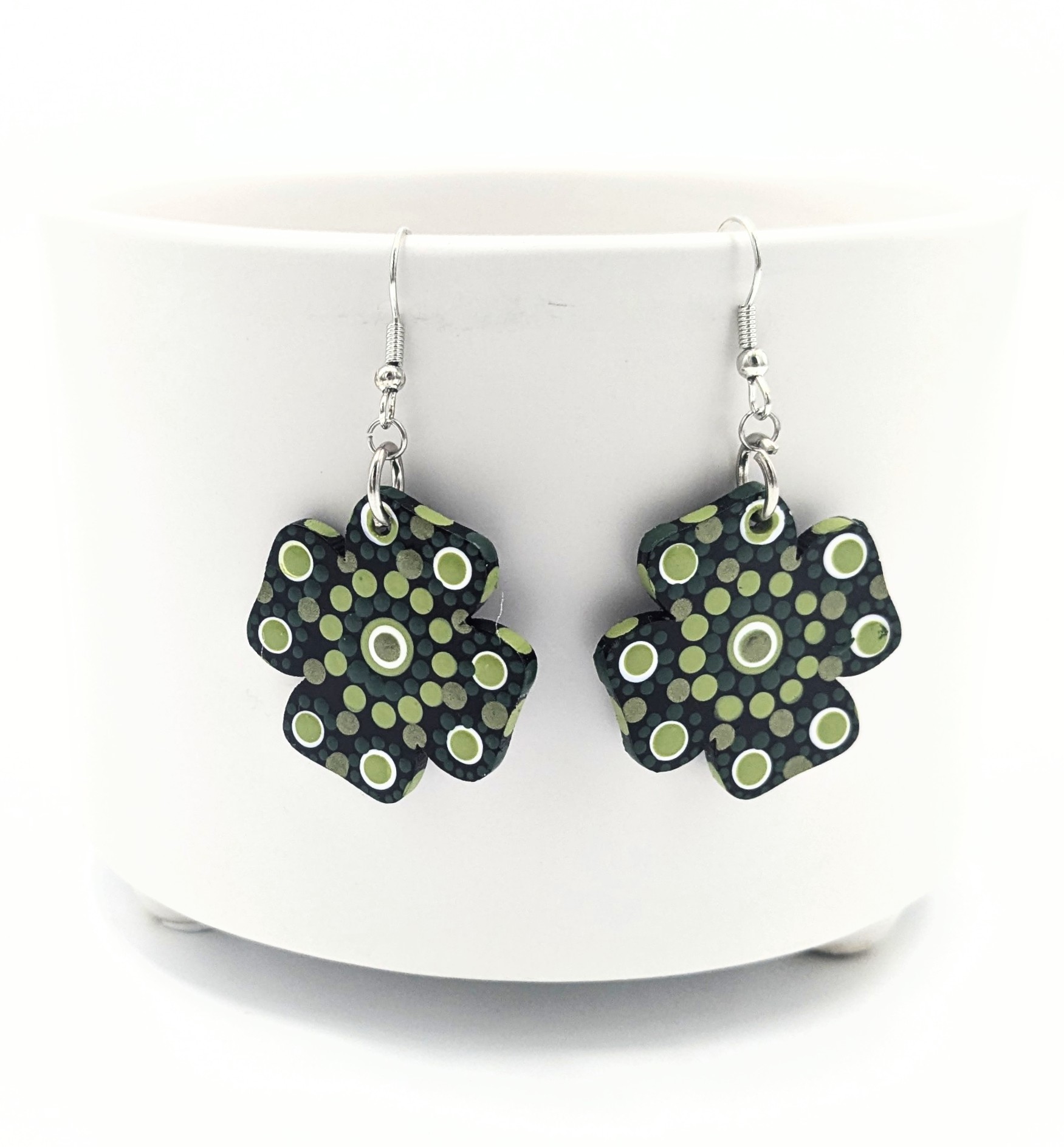 These Medium, lightweight dot mandala earrings are hand-painted on wood with fresh greens, and finished with nickel-free findings for comfortable, all-day wear. A great addition for your St. Patrick’s Day celebrations.