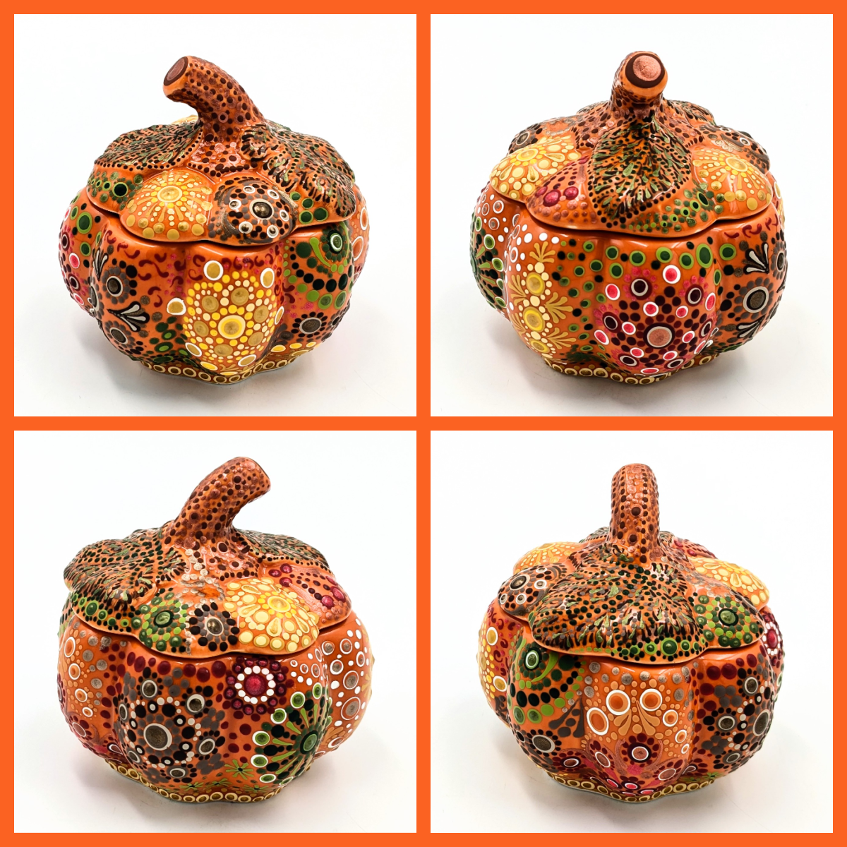 This lovingly hand-painted pumpkin bowl and lid features an intricate dot mandala design, blending lovely Fall colors with elegance. Perfect as a unique gift for art lovers or a stylish addition to any room.