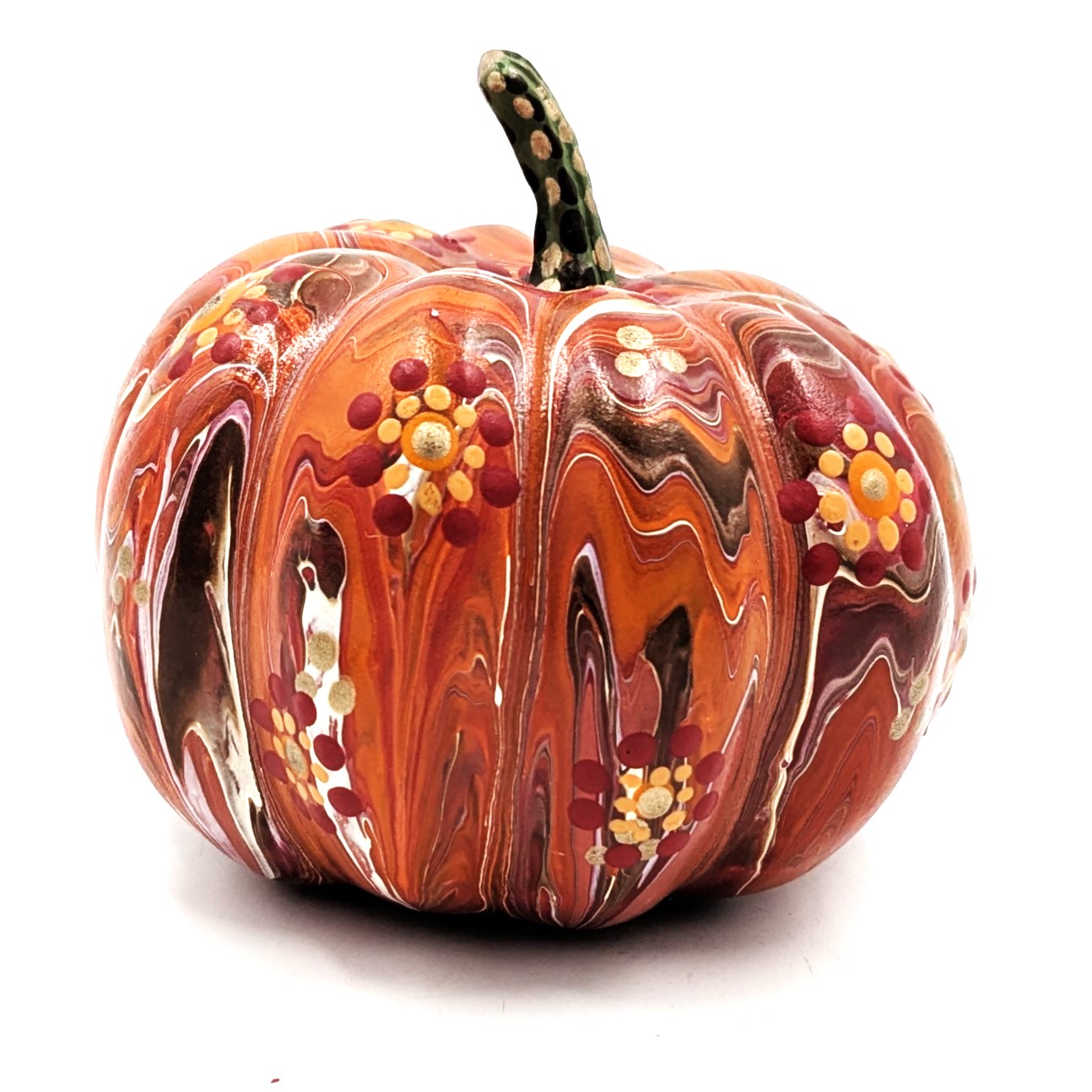 This lovingly hand-painted pumpkin features a combination of acrylic pouring art enhanced with mini dot mandala designs, blending warm Fall colors with elegance. Perfect as a unique gift for art lovers or a stylish addition to any room.