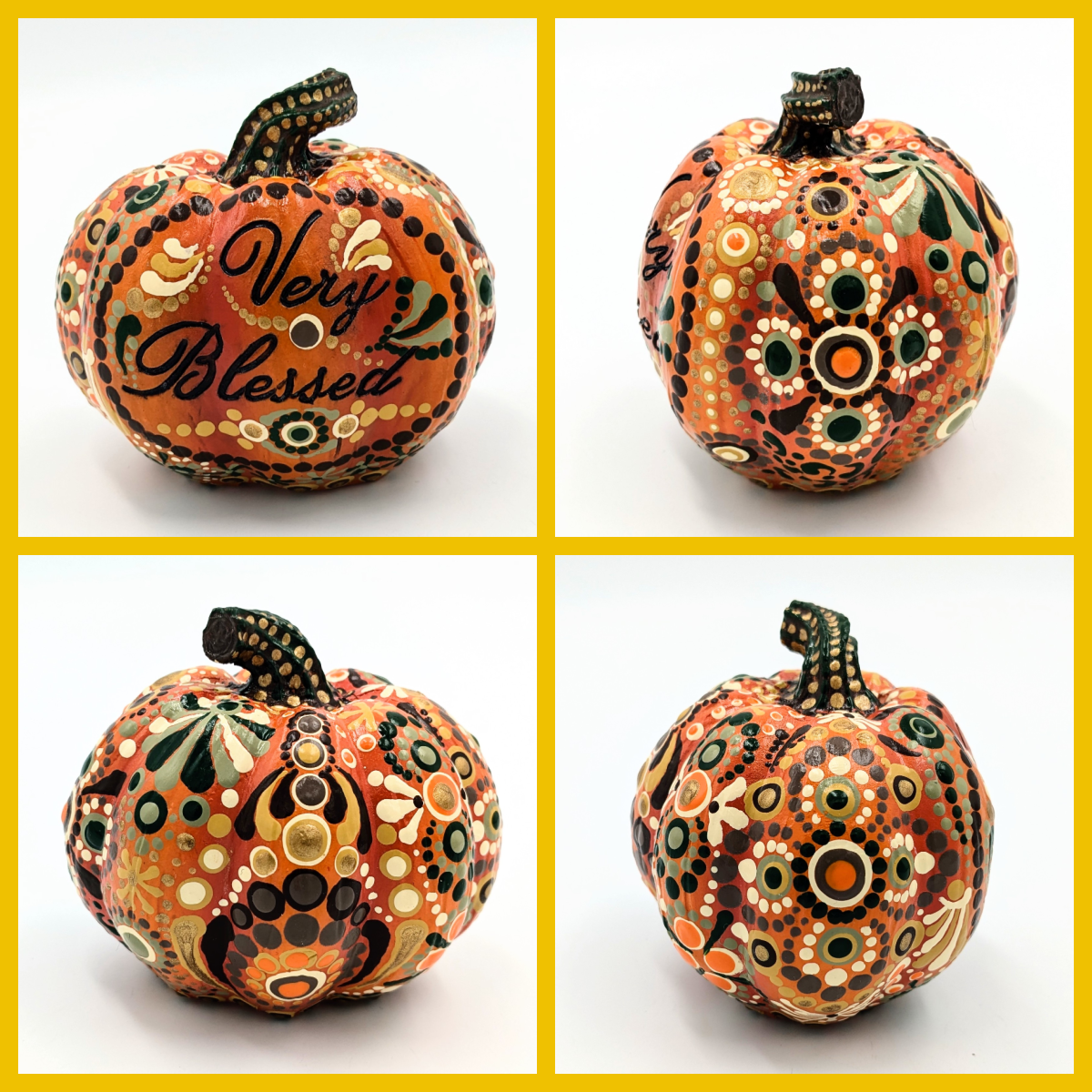 This lovingly hand-painted “Very Blessed” pumpkin features an intricate dot mandala design, blending vibrant colors with elegance. Perfect as a unique gift for art lovers or a stylish addition to any room.