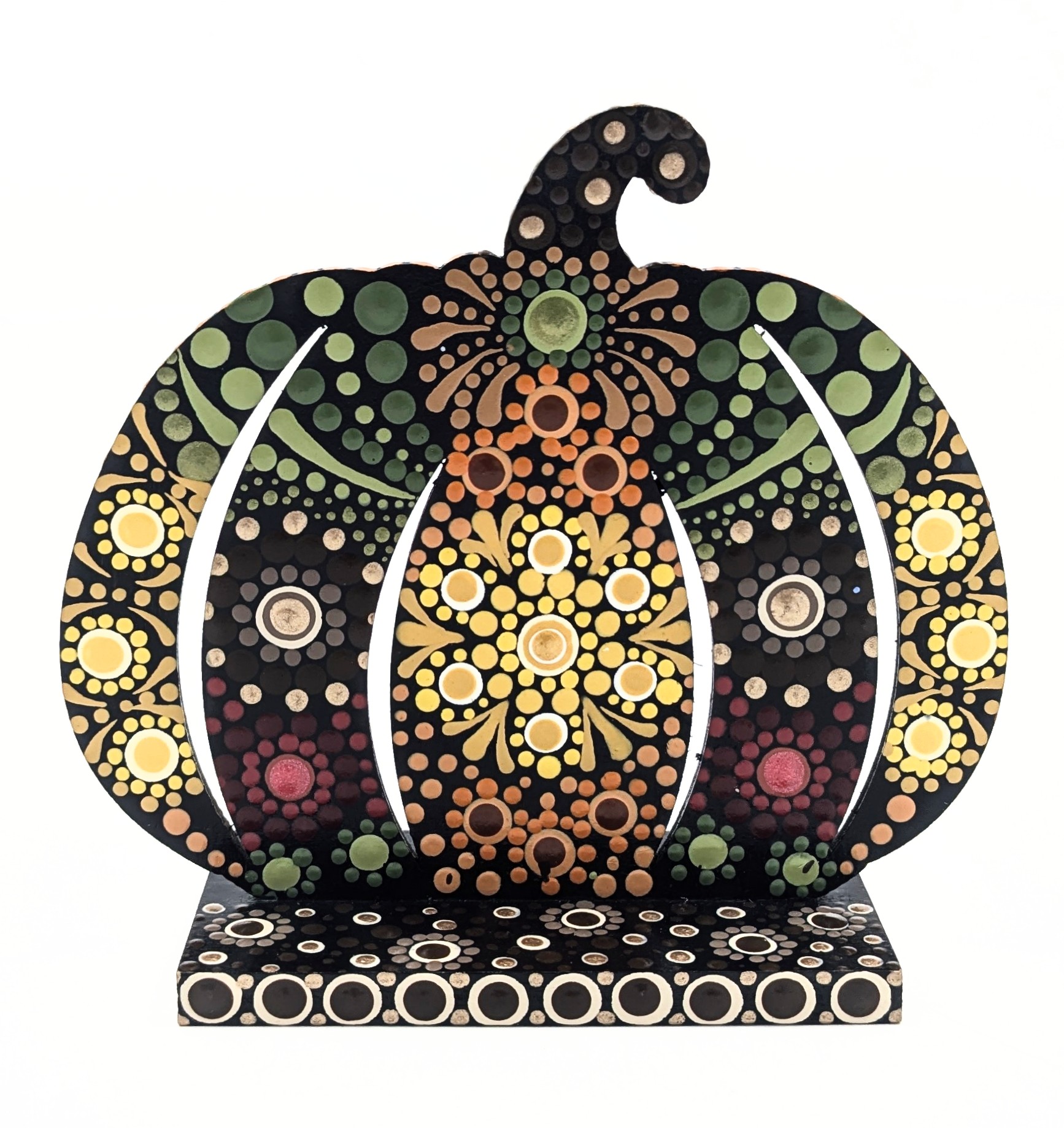 This lovingly hand-painted pumpkin stand features an intricate dot mandala design, blending vibrant colors with elegance. Perfect as a unique gift for art lovers or a stylish addition to any room.