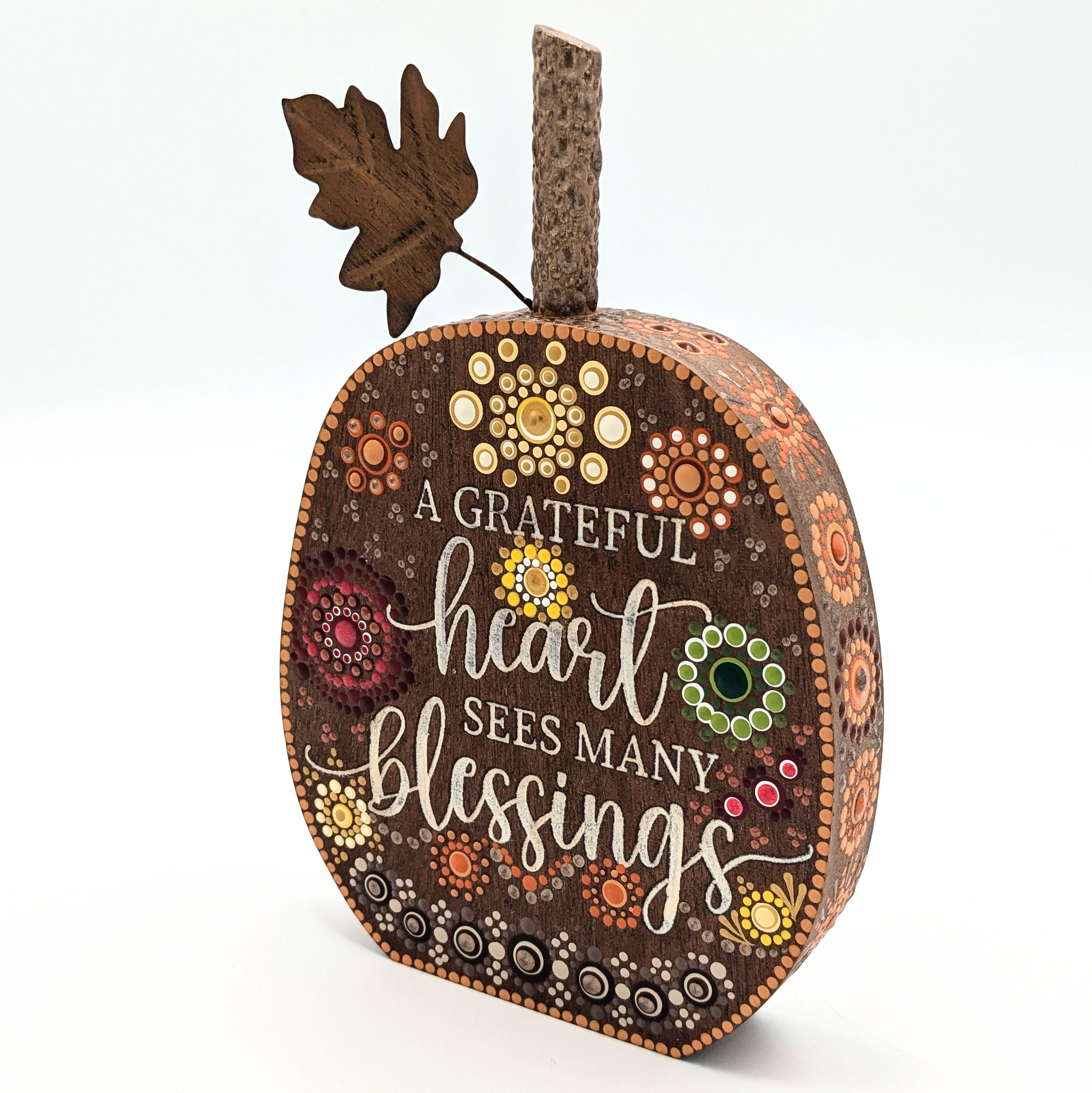 Hand-painted mandala designs gives this standing sign quiet character, making it an expressive display piece and a reminder of all we have to be grateful for.