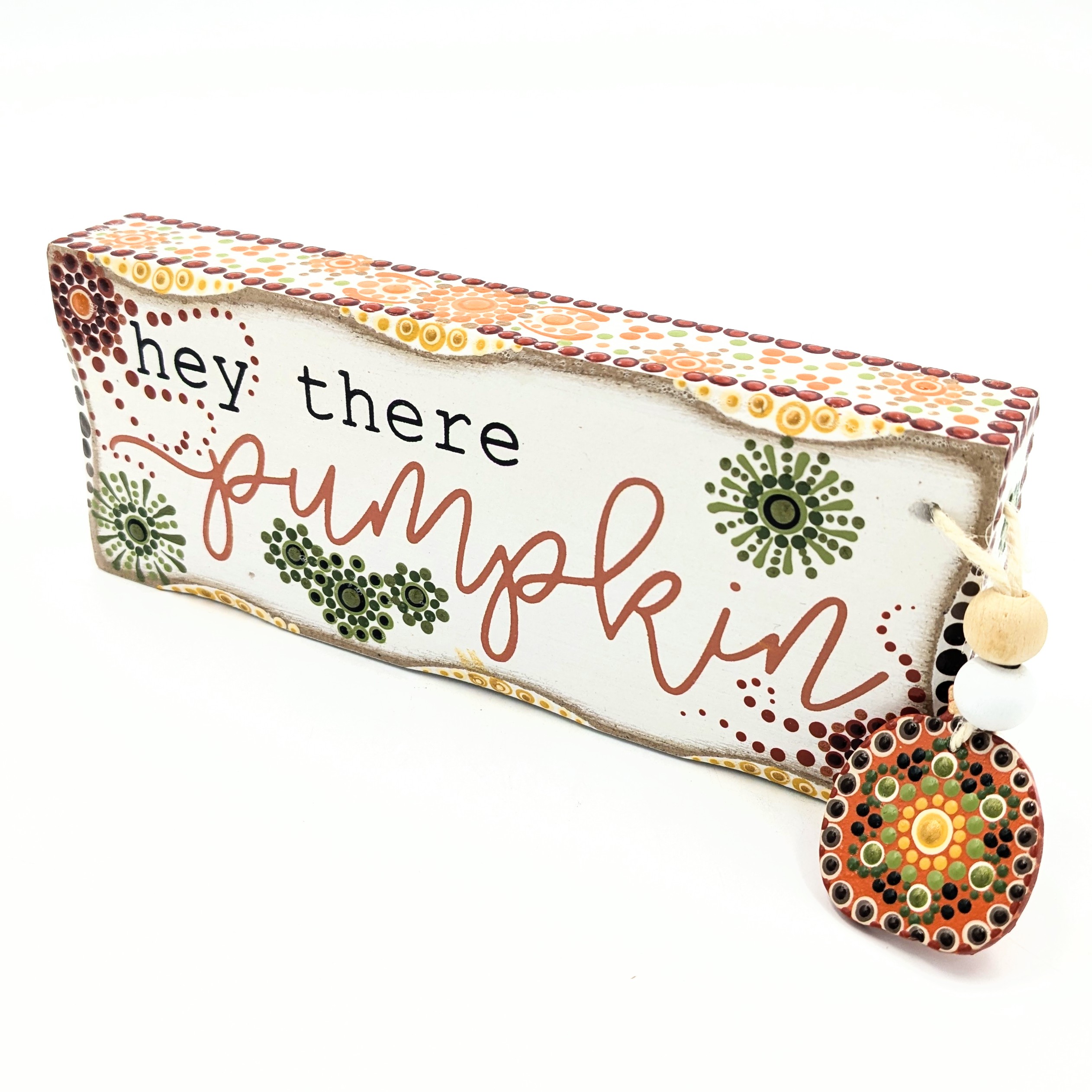 Hand-painted mandala designs gives this standing sign a fun character, making it an expressive display piece.