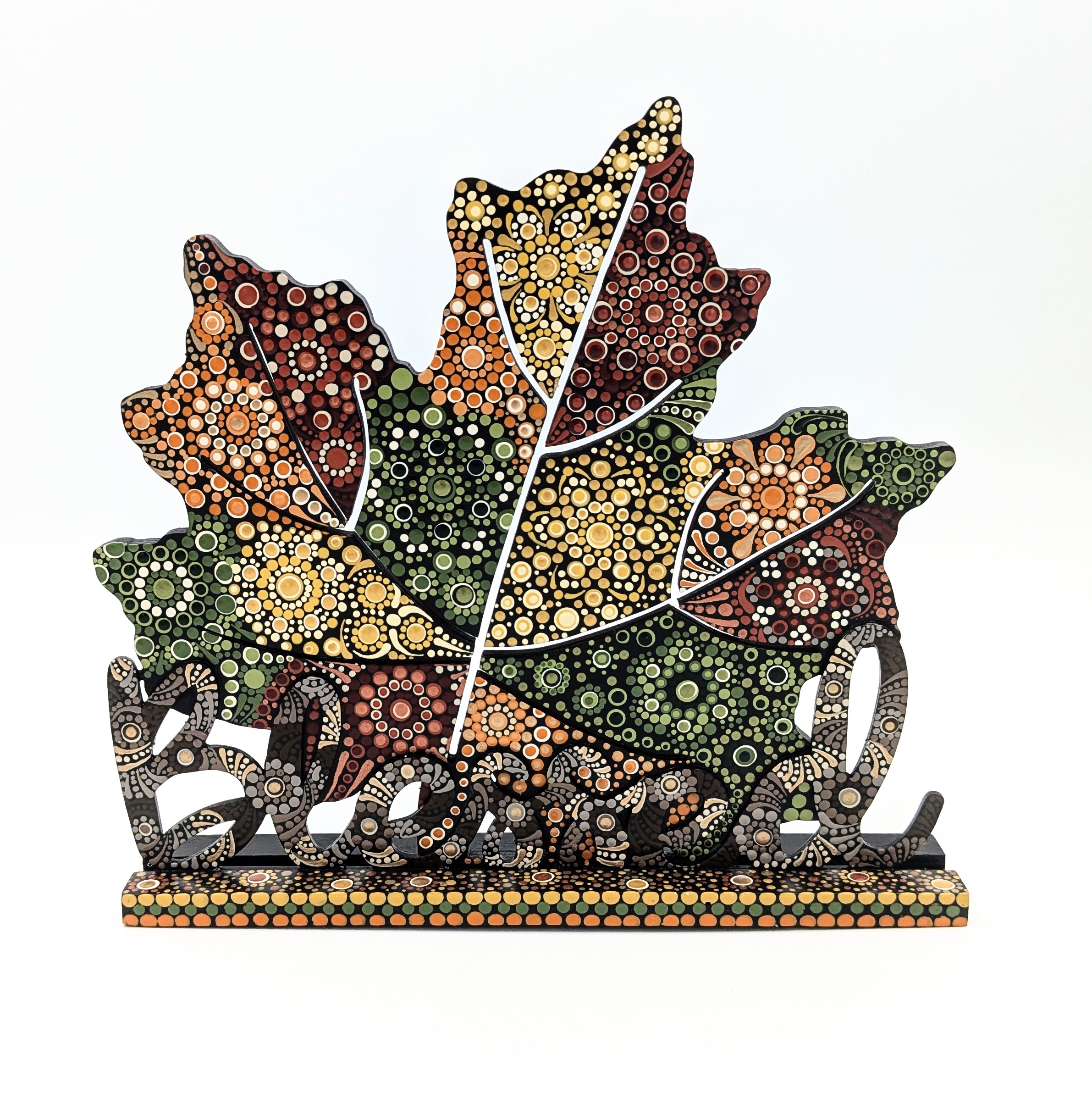 This sign features a bold dot mandala composition on a wood or metal base, sealed for long-lasting display. Style it on an entry table, bookshelf, or gallery wall to add handcrafted character.