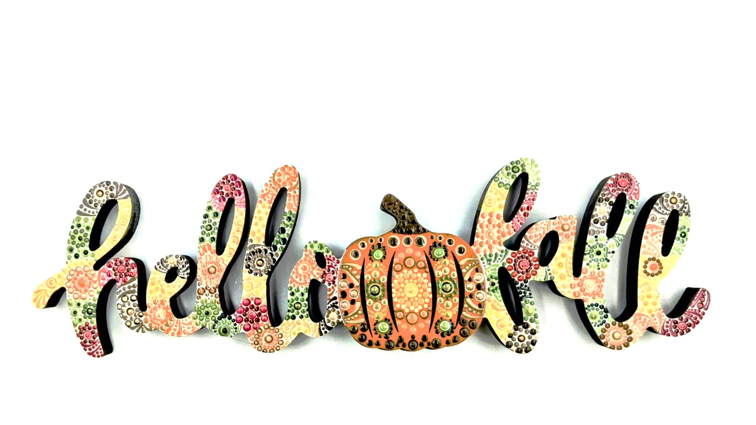 Hand-painted mandala designs gives this standing sign quiet character, making it an expressive display piece, ushering in this beautiful season.