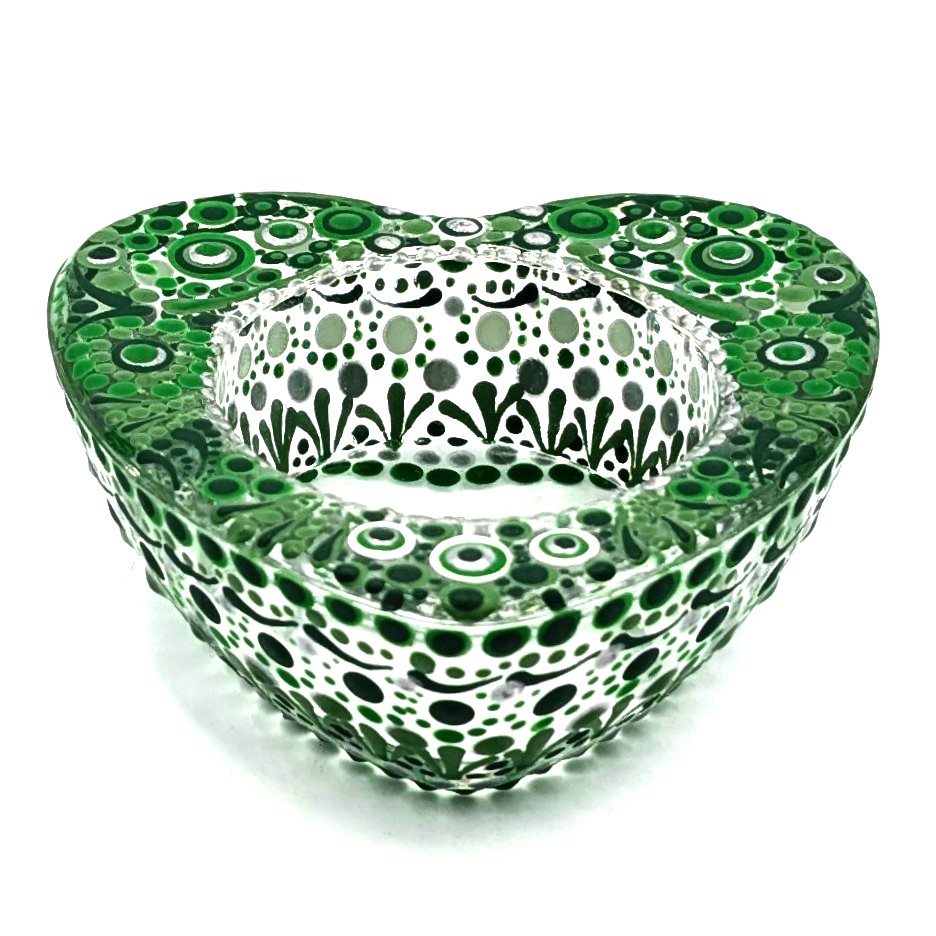 A heart-shaped glass tea light holder, hand-painted in dot mandala art, featuring greens, white and silver. It will add a soft, cozy glow and a pop of color to any space – perfect for shelves, tables, or bedside ambiance.