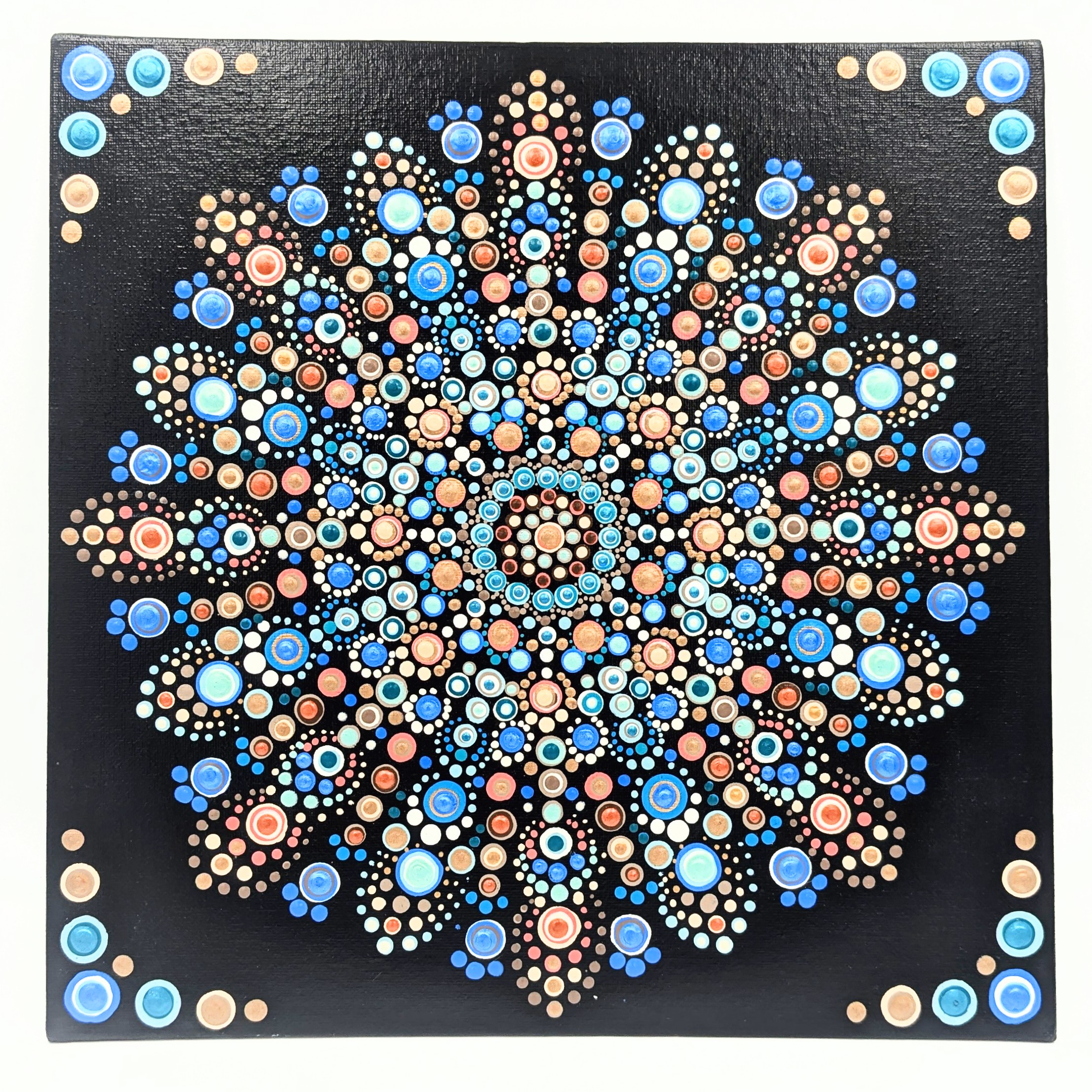 A hand-painted canvas that blends crisp geometric mandala designs with vibrant color, inspired by the beauty of the seaside – ready to elevate any wall with modern, handcrafted art.