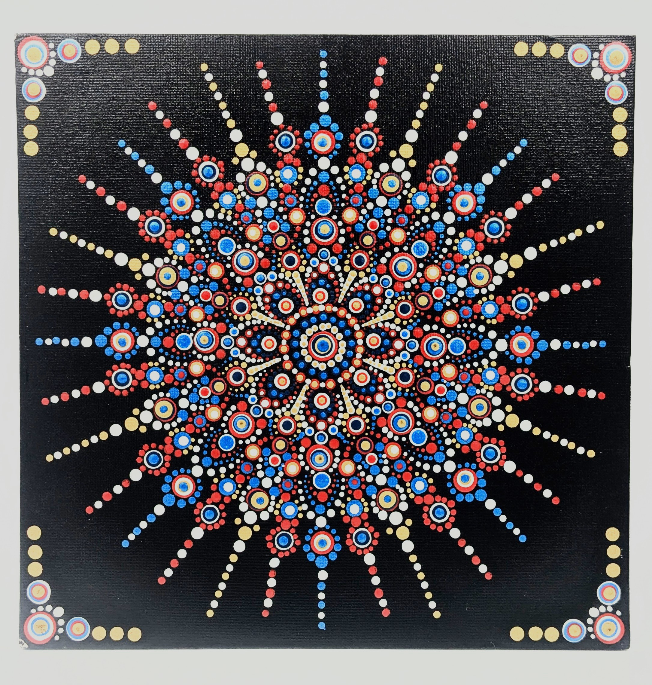 A hand-painted canvas that blends crisp geometric mandala designs with vibrant colors to celebrate the beauty of the red, white, and blue, honoring the USA – ready to elevate any wall with modern, handcrafted art.