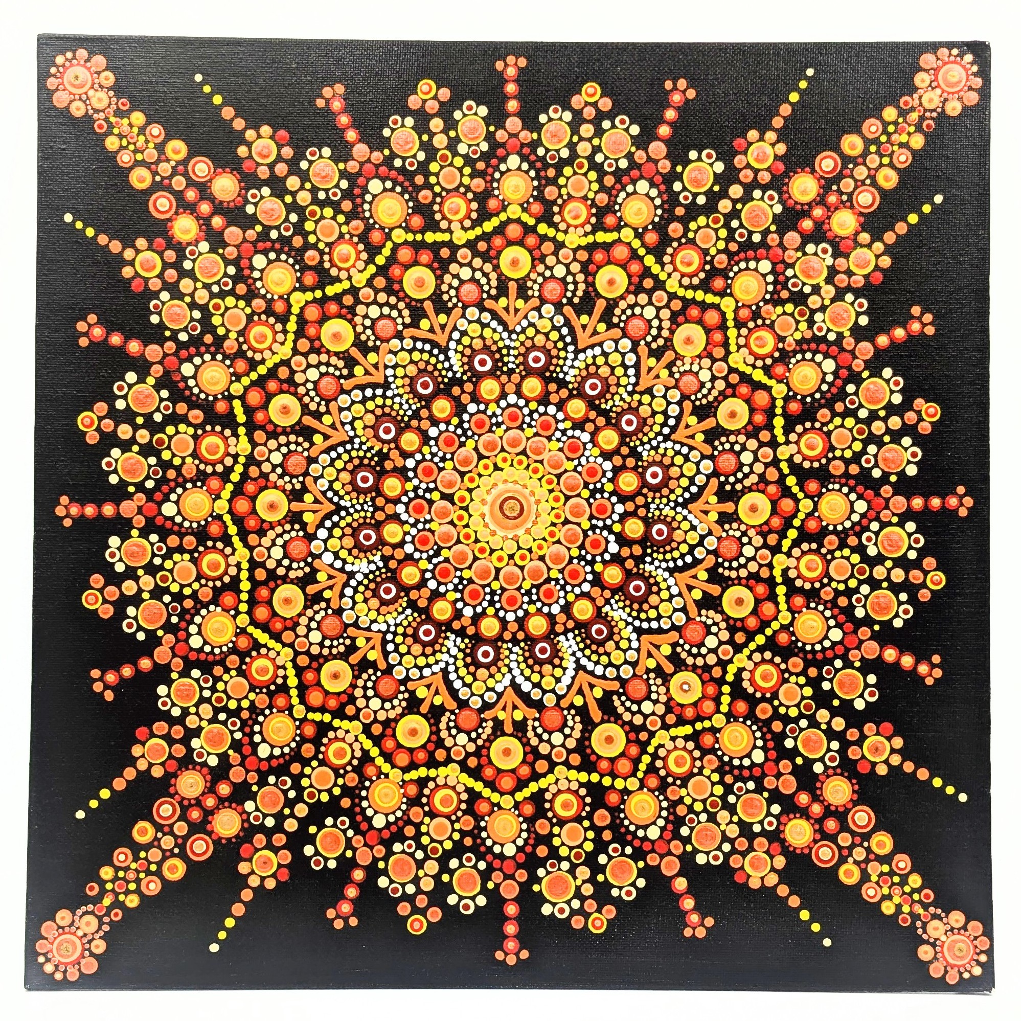 This original canvas features a meticulously painted dot mandala composition, balancing symmetry with rich, layered color. The canvas can be hanged as-is or placed in a frame for added depth. It is sealed for longevit and ready for effortless in living rooms, offices, or creative studios. Whether styled solo as a focal point or grouped in a gallery wall, it brings movement, texture, and a sophisticated pop of color to your space. Each canvas is one-of-a-kind, reflecting your appreciation for craftsmanship and design.